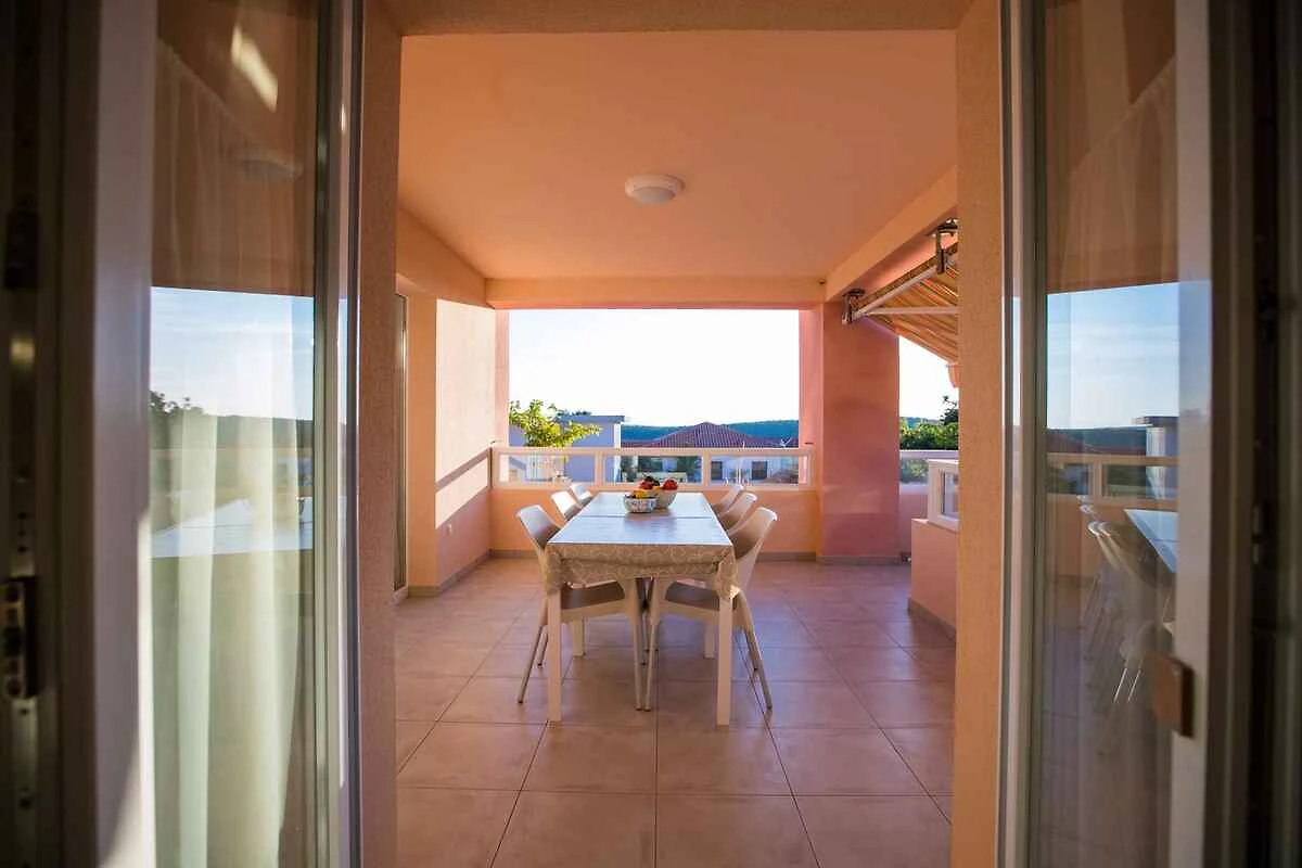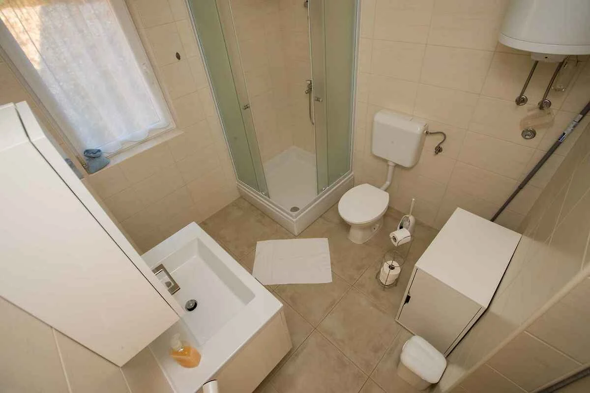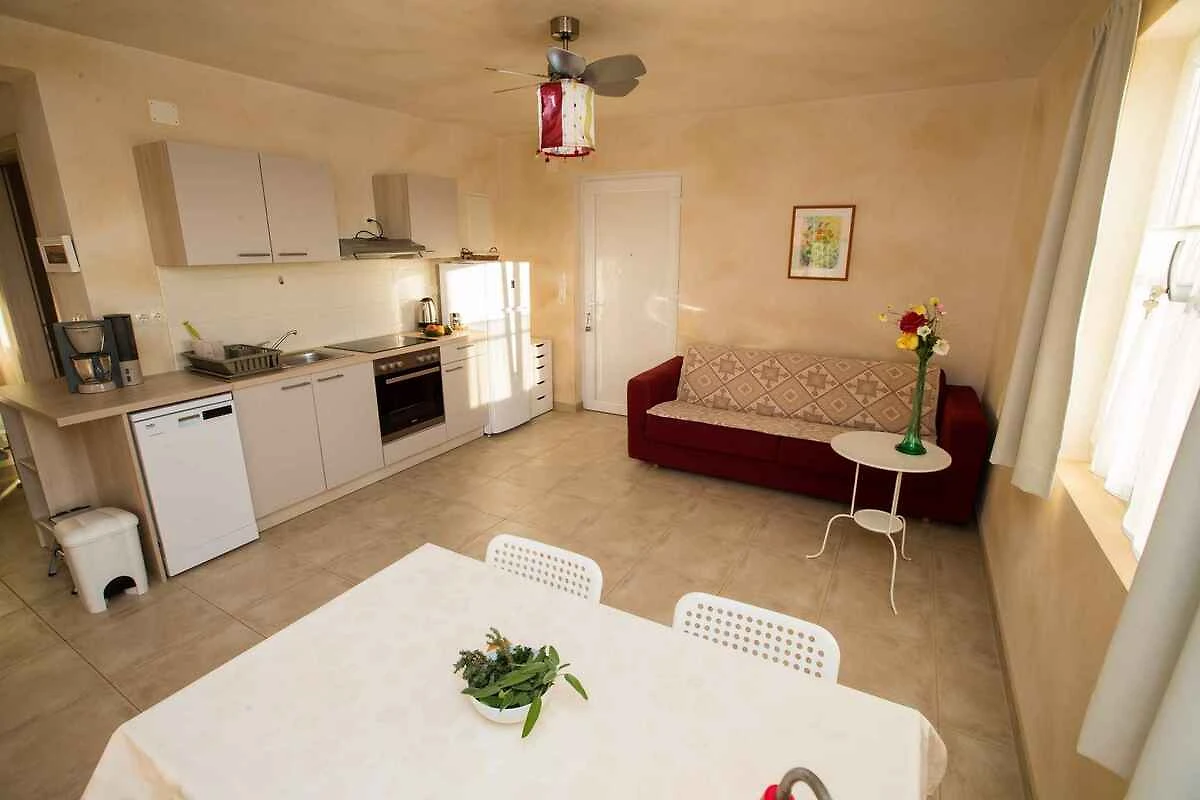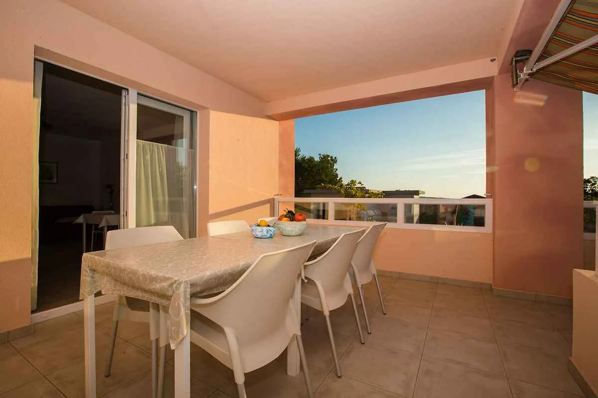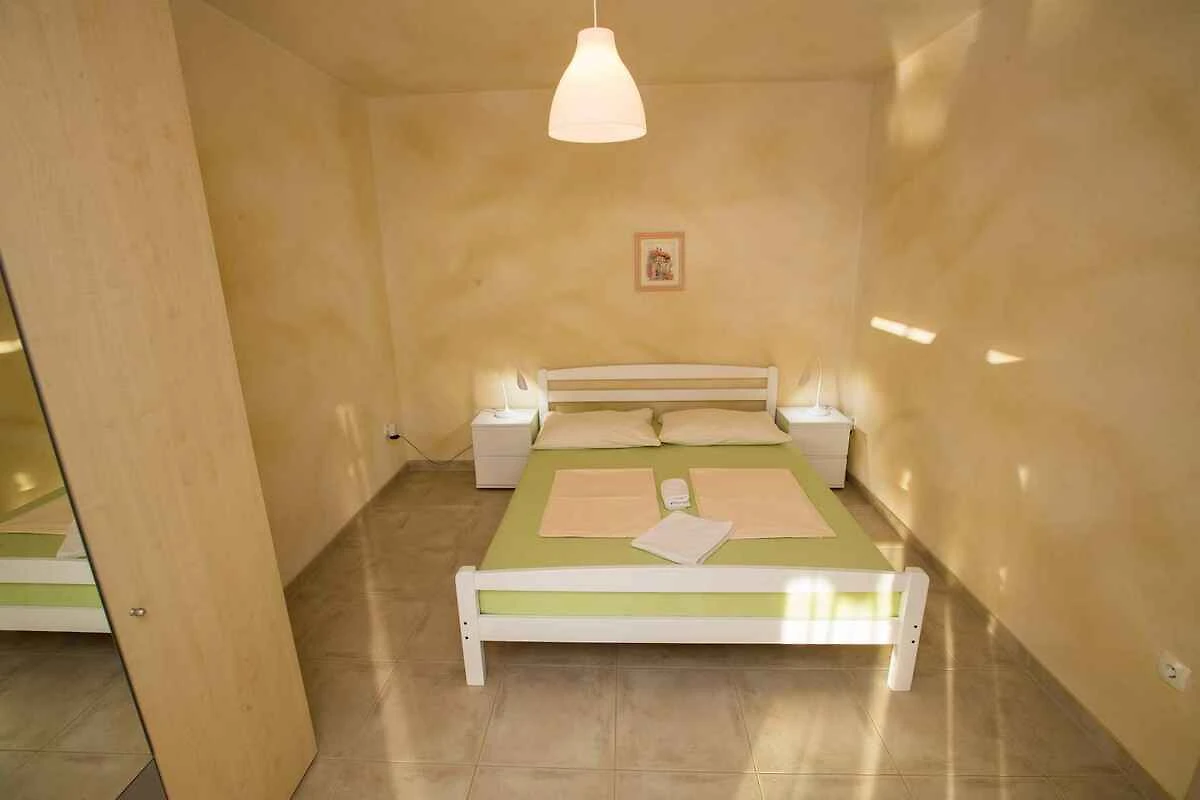 Rab, Ortsteil Barbat. Die Ferienwohnung befindet sich auf einem geschlossenen Gartengrundstück mit Wiese, Blumen, Sträuchern und Bäumen, von einem Zaun begrenzt. Der Vermieter wohnt ständig im Haus, nutzt jedoch einen separaten Eingang. Die Zufahrt erfolgt über eine Nebenstrasse (asphaltiert). Parkplatz auf dem Grundstück.