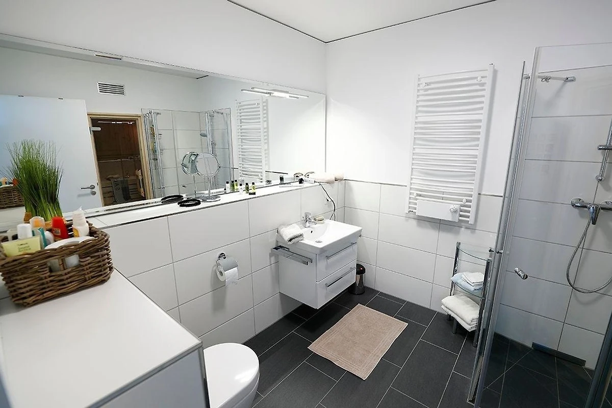 Das grosszügige Bad, mit bodentiefer Dusche, sorgt beim morgendlichen Zähneputzen für gute Laune.