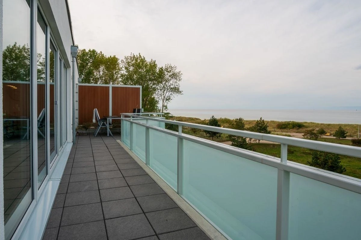 Vom Wohnzimmer aus gelangen Sie auf den Balkon mit Blick zur Düne.