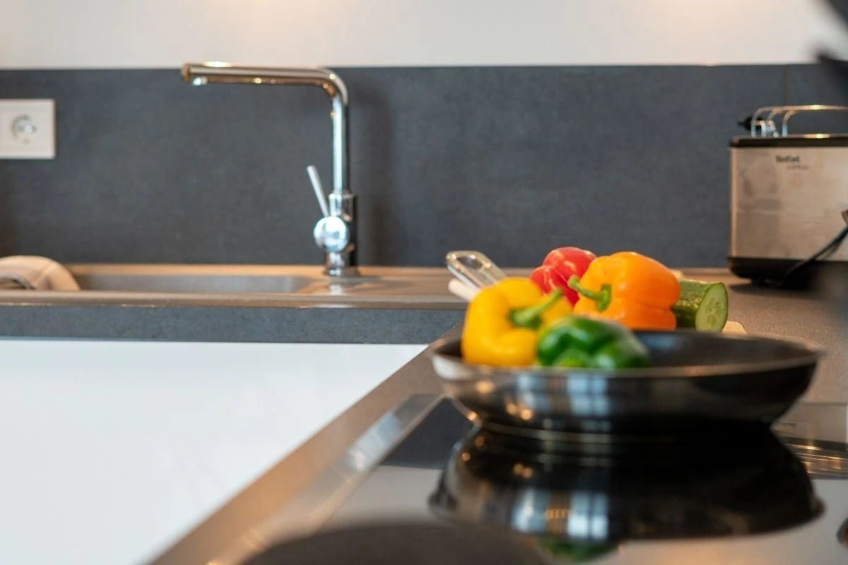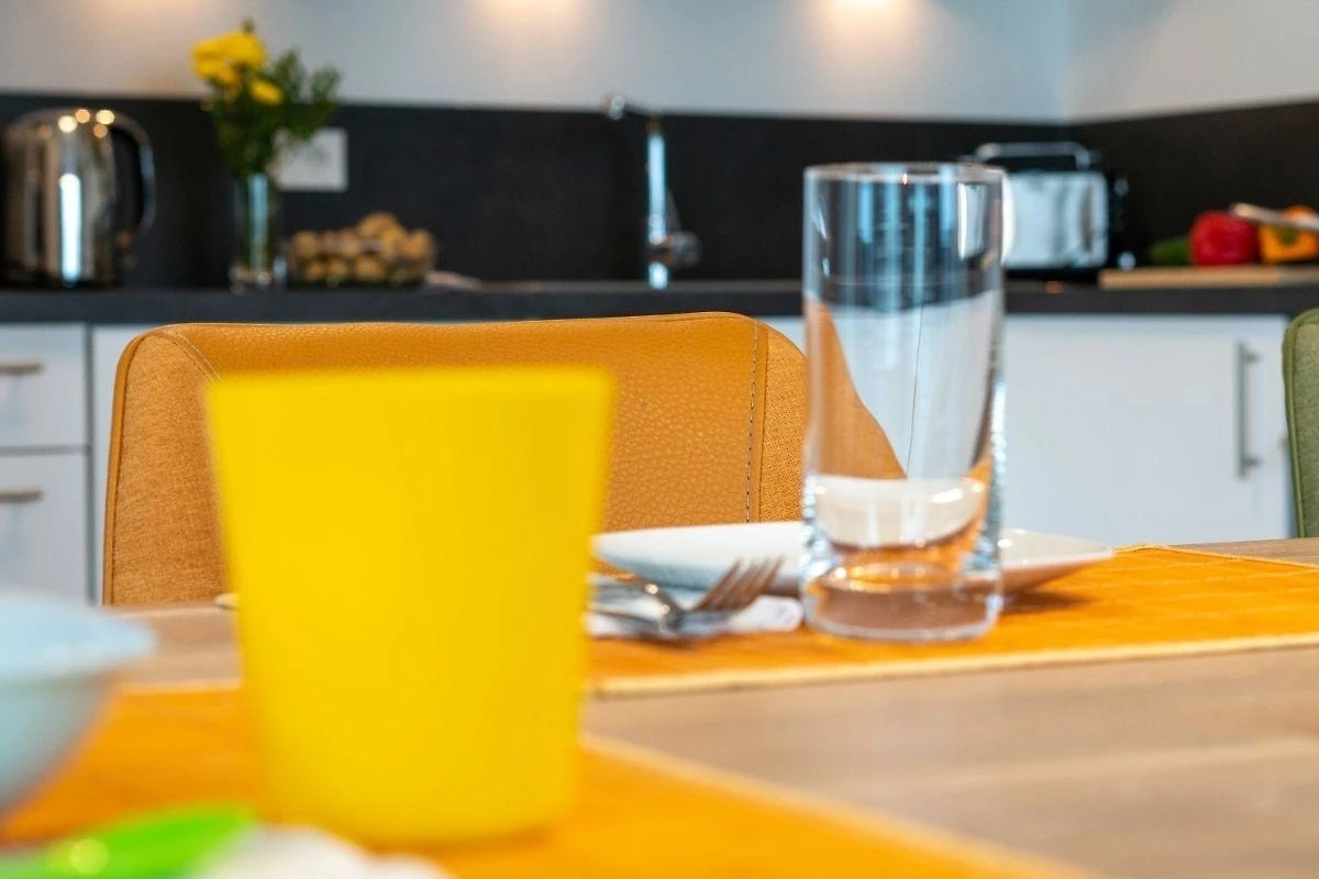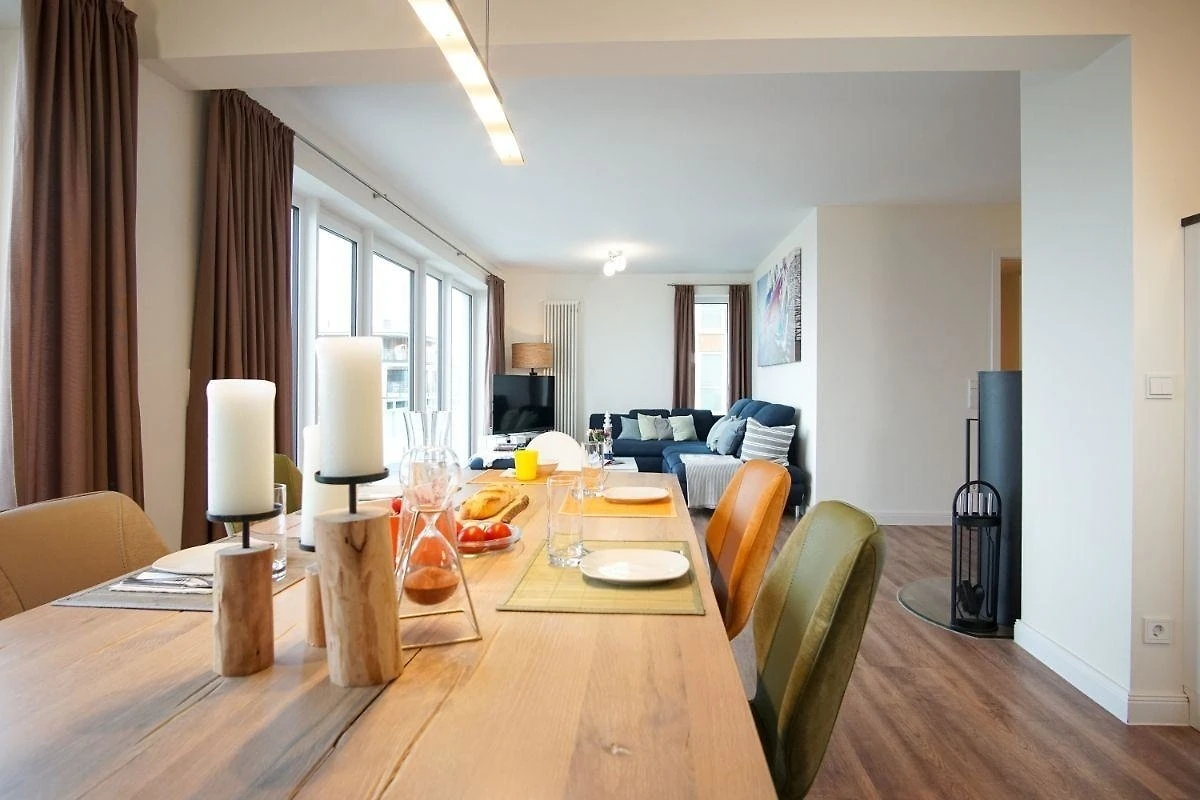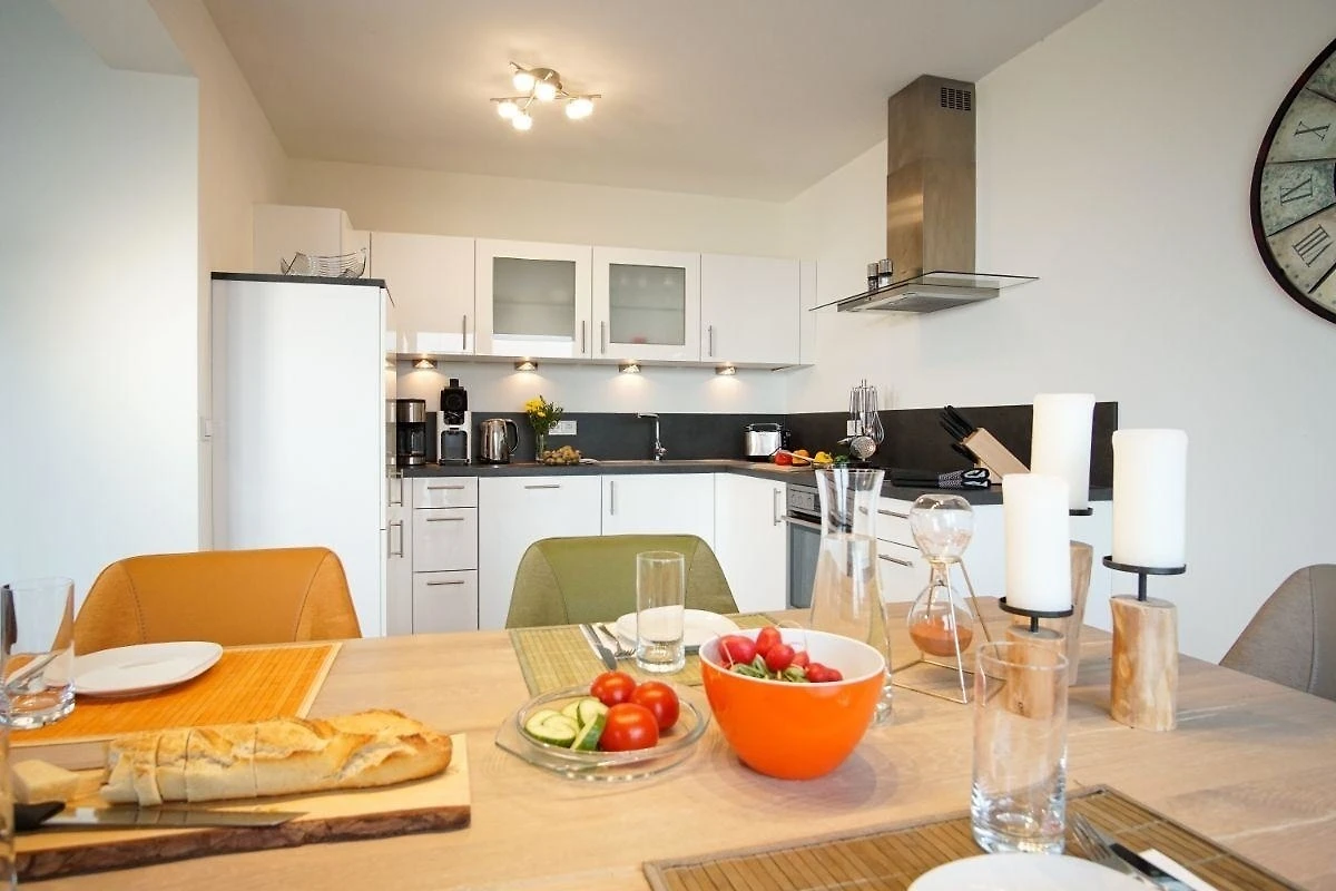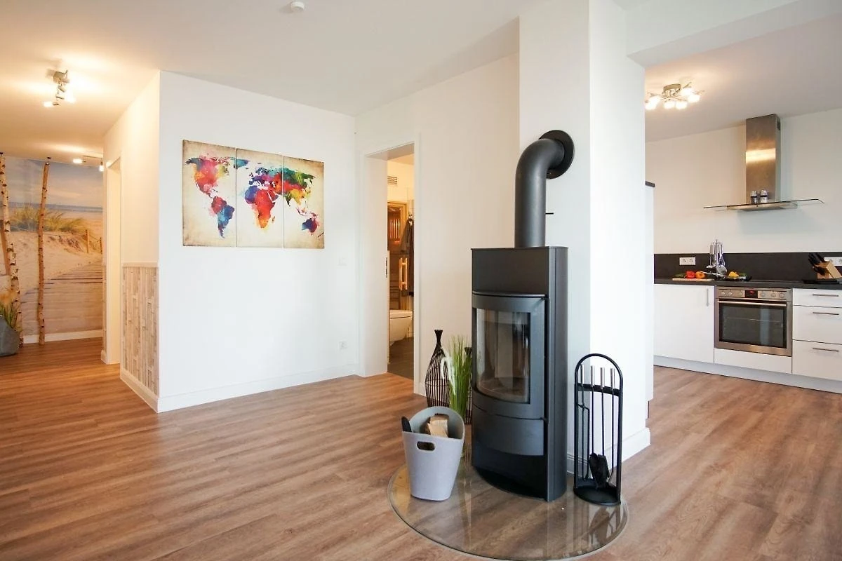 Urlauben Sie auf grosszügigen 98 m² (2. Etage) mit Nordost-Balkon. Das lichtdurchflutete Wohnzimmer ist mit einer gemütlichen Sofaecke, Kaminofen und Flatscreen-TV ausgestattet. Im Essbereich finden bequem vier Personen Platz zum Schlemmen. Die angrenzende Küchenzeile ist, für den Urlaubsbedarf, voll ausgestattet. Ein Backofen und ein Geschirrspüler gehören ebenso dazu, wie die Kaffeemaschine, der Wasserkocher und ein Toaster. Geschirr und Besteck sind ausreichend vorhanden.