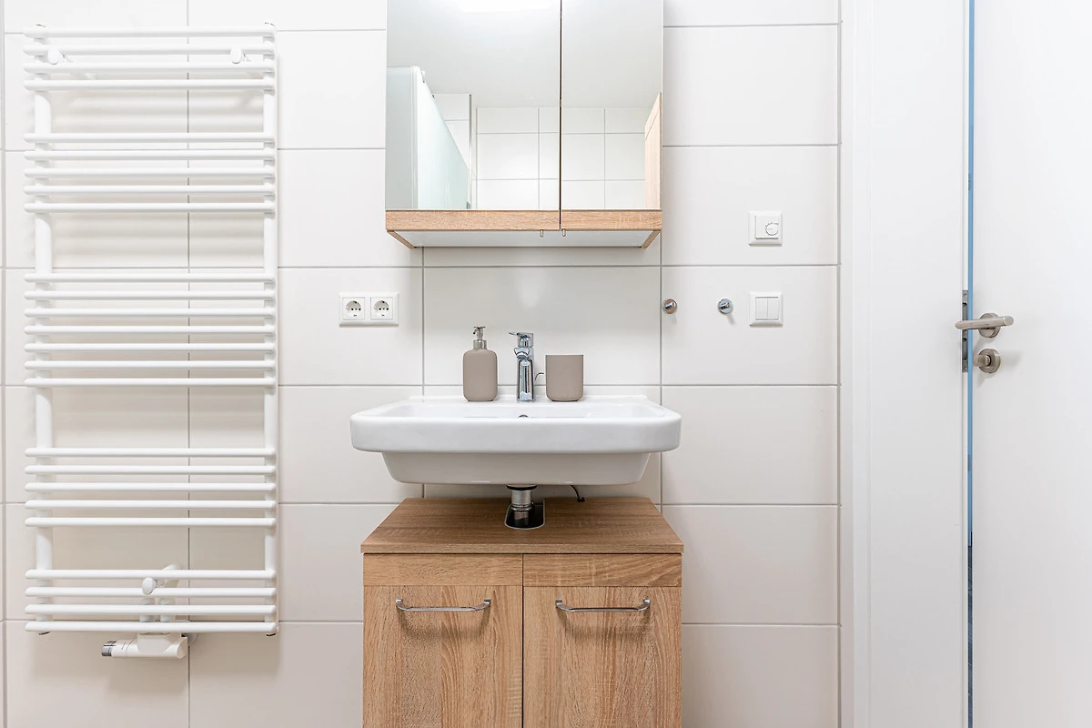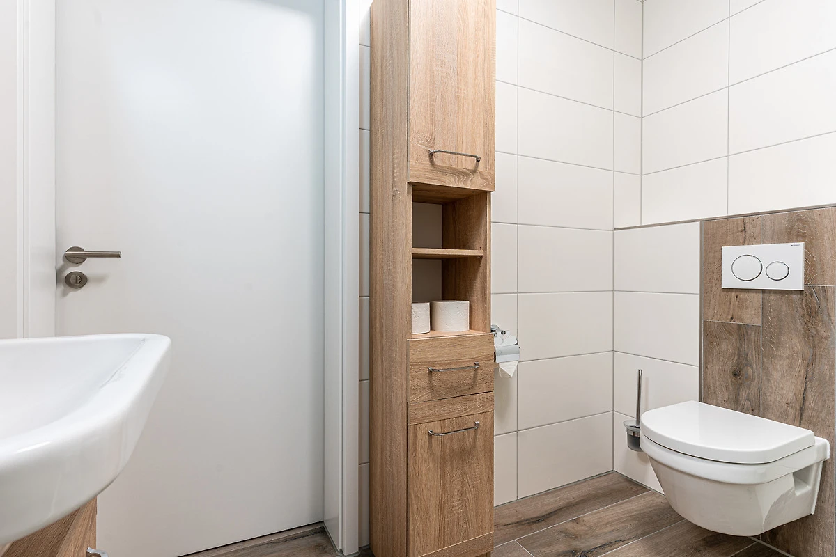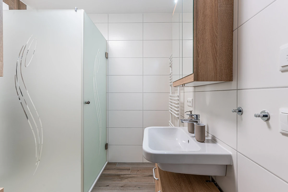 Das Badezimmer verfügt über eine ebenerdige Dusche, WC sowie einem schönen Waschtisch mit beleuchteten Spiegel.