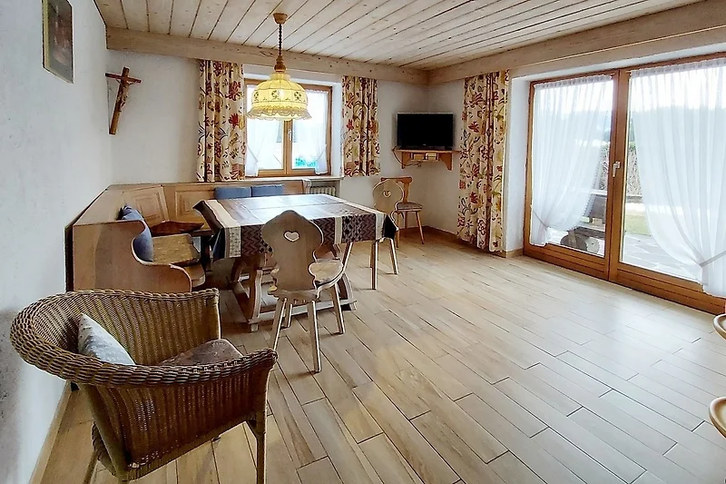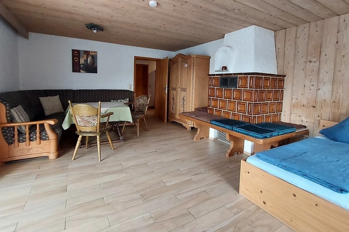 Ein gemütliches und geräumiges Wohn-/Esszimmer mit Eckbank und Polstersitzgruppe, TV, Radio und Kachelofen lädt zum gemeinsamen Essen und Beisammensitzen ein, WLAN ist vorhanden.