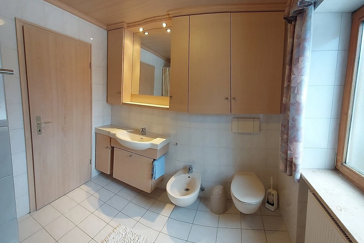 Das schöne, grosszügig eingerichtete Badezimmer verfügt über Badewanne, Dusche, Bidet, Waschtisch und WC.