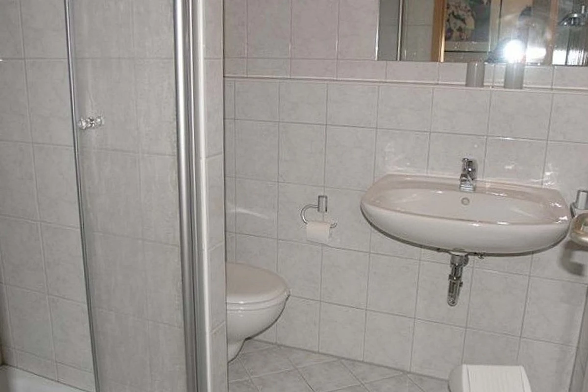 Im Badezimmer gibt es einen Waschtisch, eine Dusche und ein WC.
