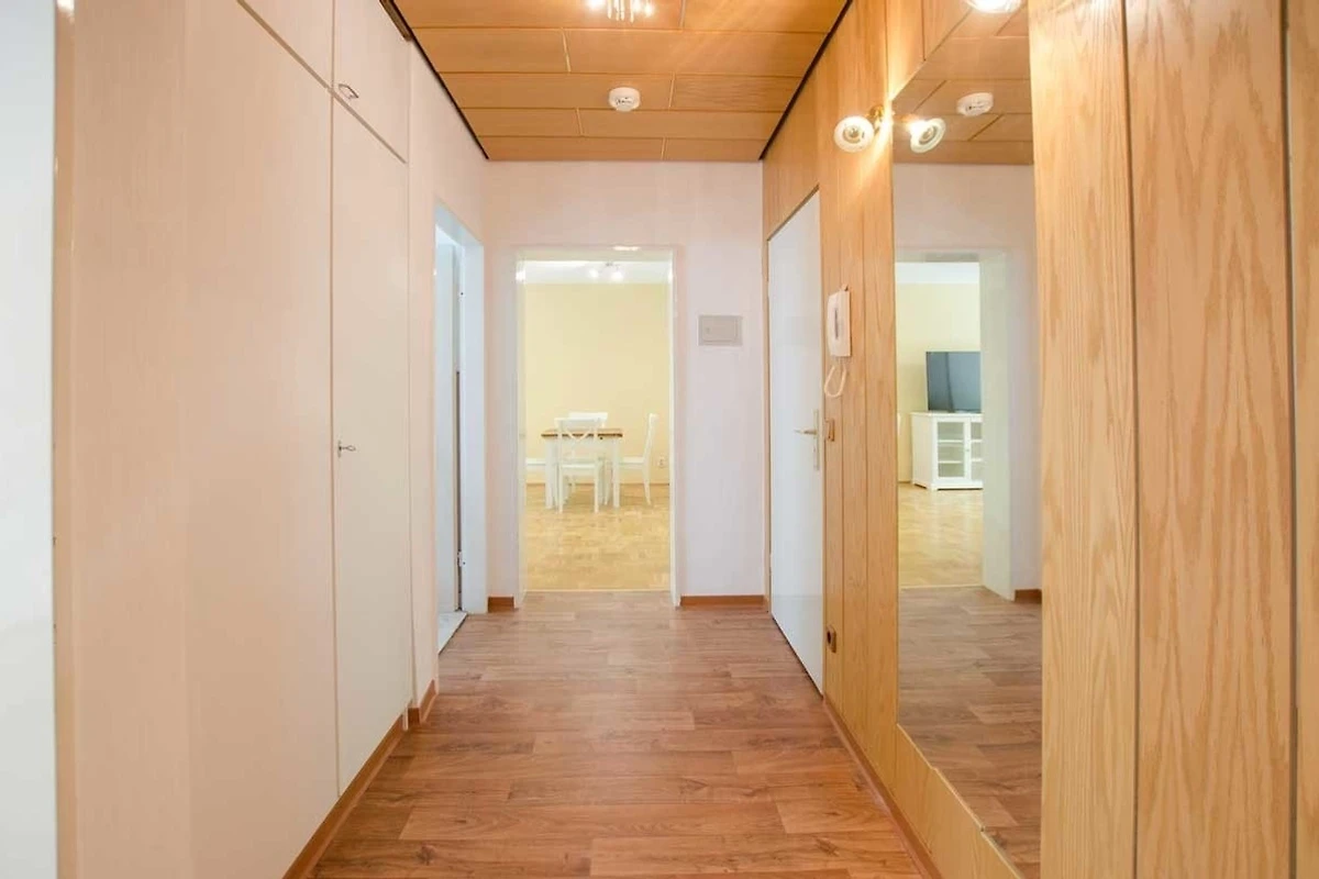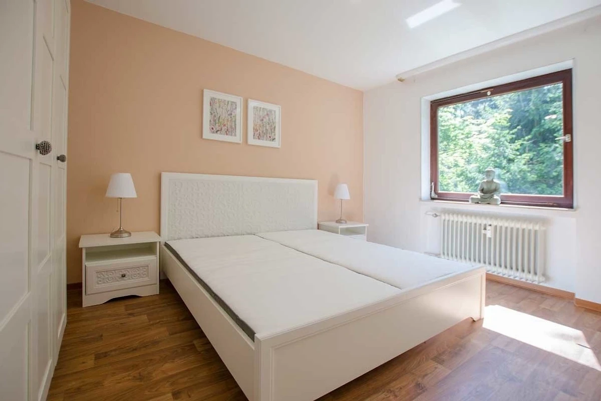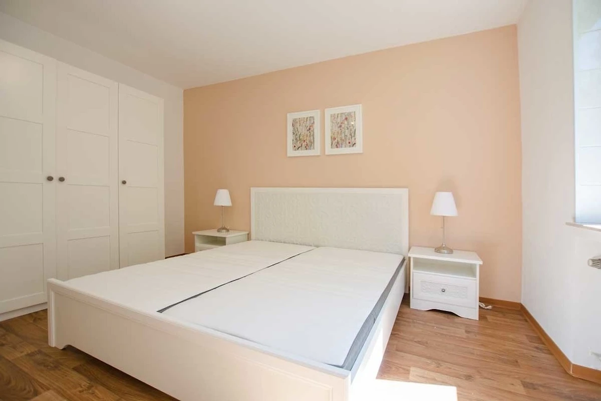 Das separate Schlafzimmer ist mit Doppelbett (180x200, tiefer Einstieg), Nachtschränken mit Leseleuchten und grossem Kleiderschrank eingerichtet. Das Fenster ist innen mit Verdunklungsrollo ausgestattet. Wir haben im Schlafzimmer einen zweiten Fernseher an der Wand montiert, sodass Sie auch im Bett das Fernsehprogramm geniessen können.