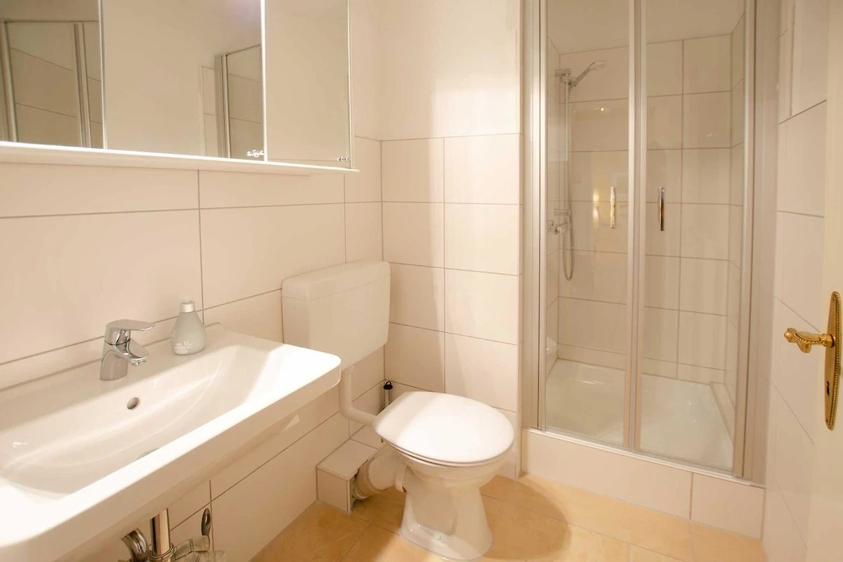 Das Badezimmer verfügt über Dusche, Waschtisch und WC.