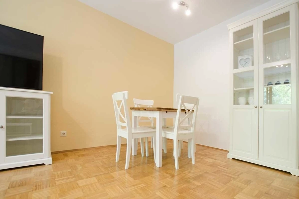 Die Ferienwohnung verfügt über ein Wohn-Schlafzimmer mit Wohn-Schlafcouch, Couchtisch, Cocktailsessel, Kommode mit grossem Flachbild-TV und einen Essbereich mit 2 Stühlen.