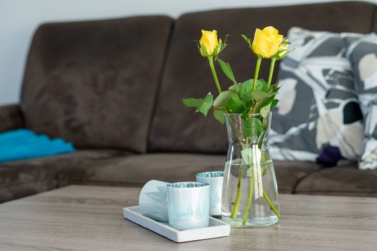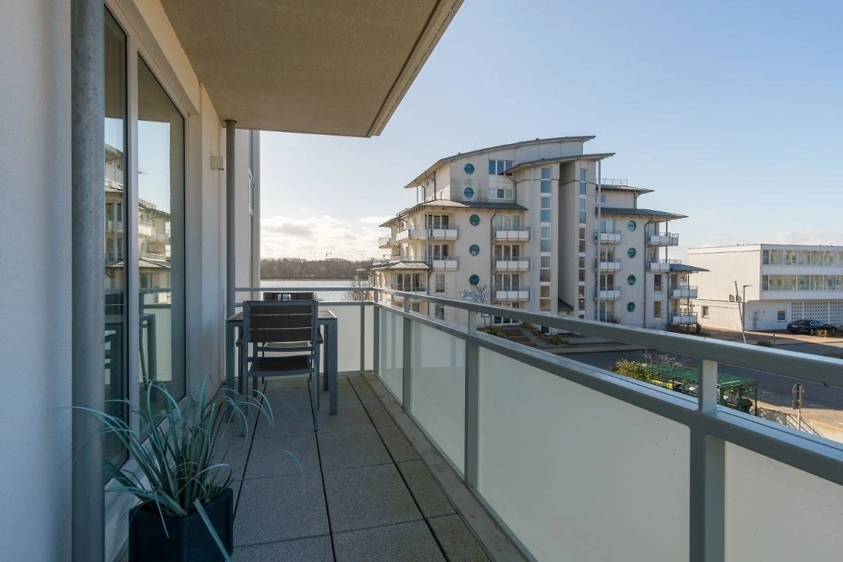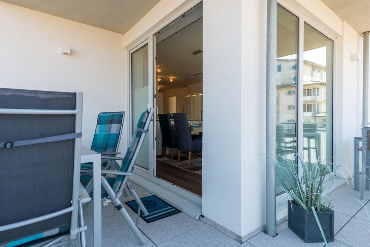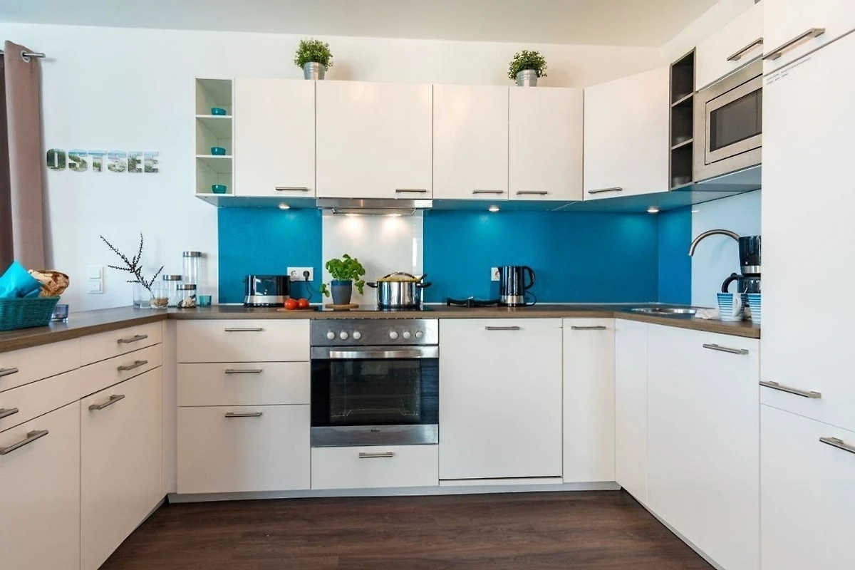 Urlauben Sie auf grosszügigen 76 m² (1. Etage) mit Nordwest-Balkon. Das lichtdurchflutete Wohnzimmer (Blick zum Binnensee und zur Ostsee) ist mit einer gemütlichen Sofaecke und Flatscreen-TV ausgestattet. Im Essbereich finden bequem vier Personen Platz zum Schlemmen. Die angrenzende Küchenzeile ist, für den Urlaubsbedarf, voll ausgestattet. Ein Backofen und ein Geschirrspüler gehören ebenso dazu, wie die Kaffeemaschine, der Wasserkocher ein Toaster, eine Mikrowelle, ein Elektrogrill und eine Waschmaschine. Geschirr und Besteck sind ausreichend vorhanden.