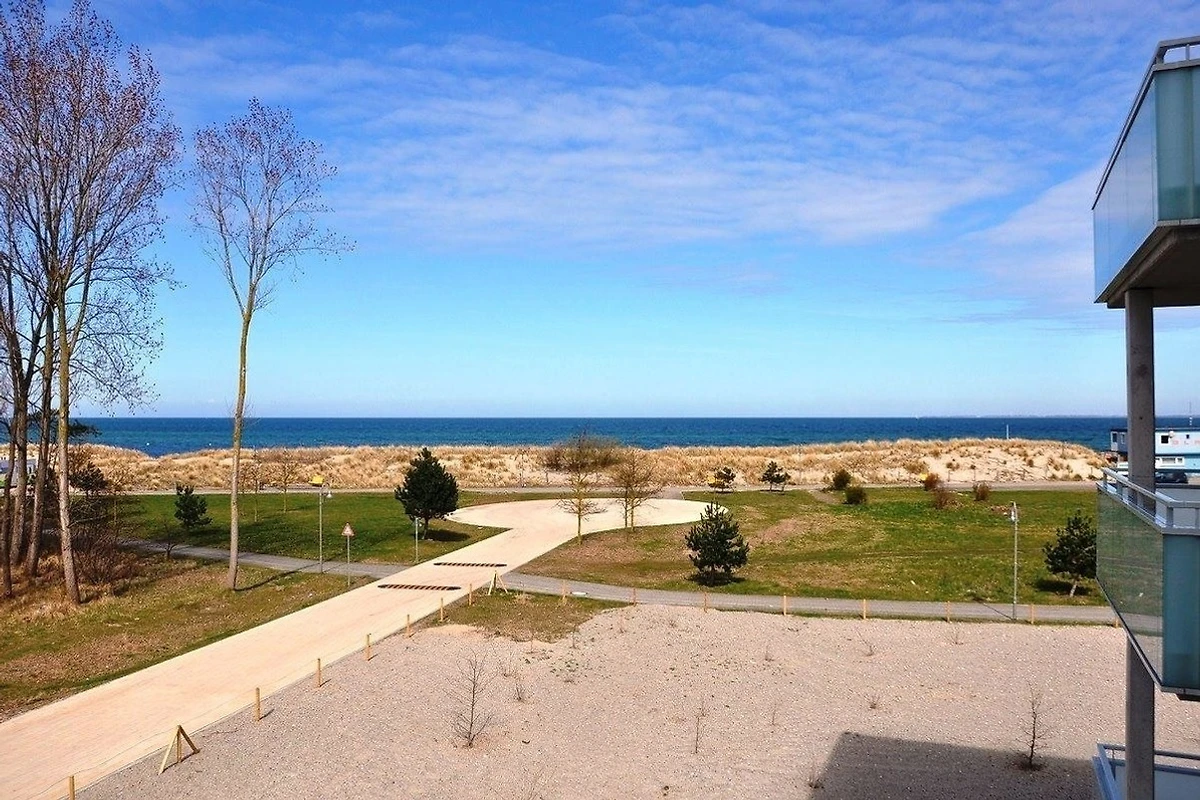Vom Wohnzimmer aus gelangen Sie auf den Balkon mit Blick zur Düne.