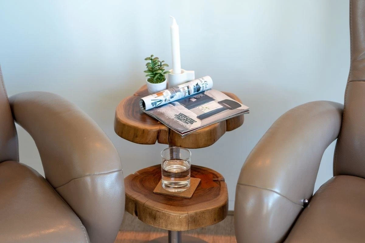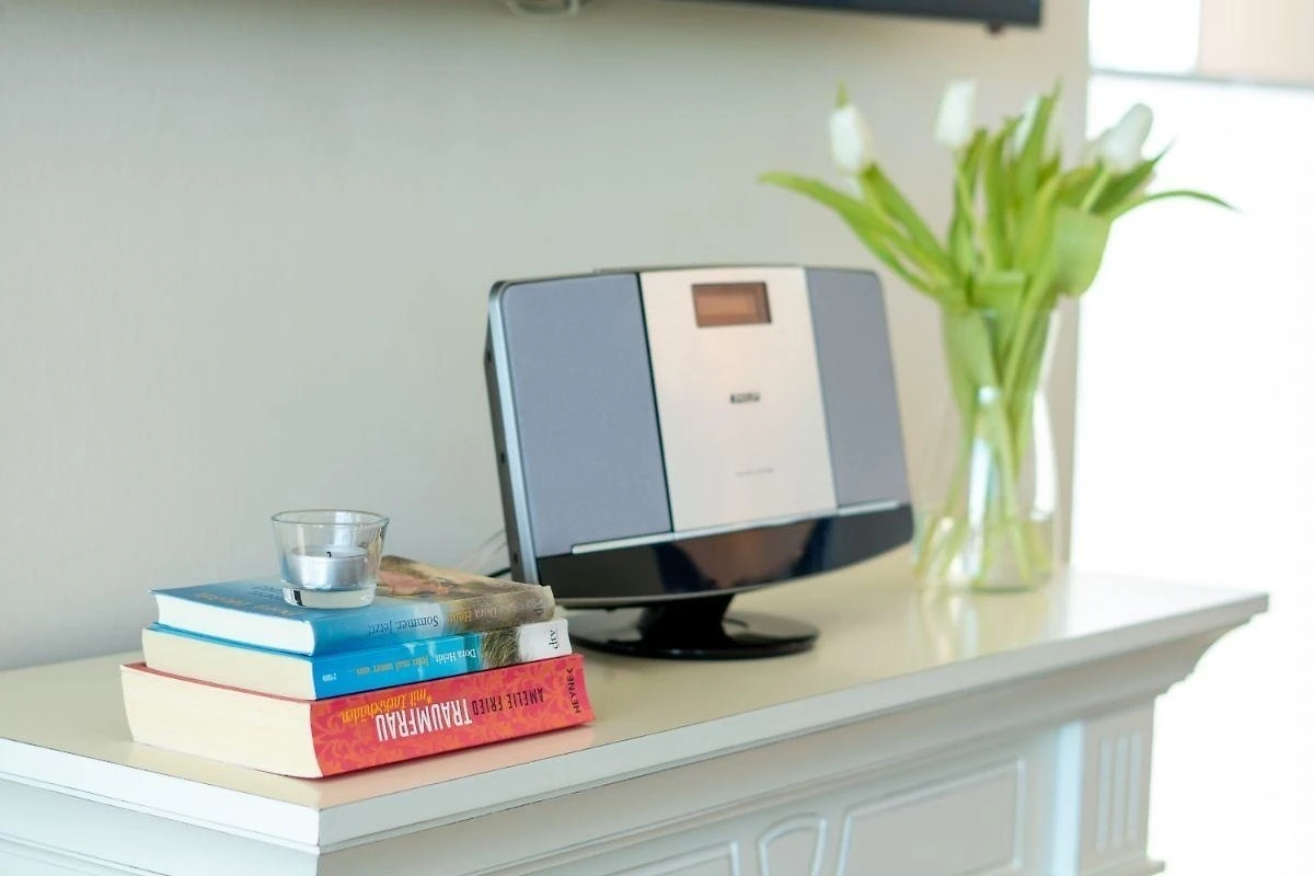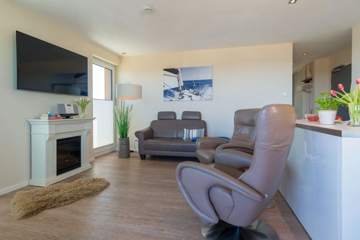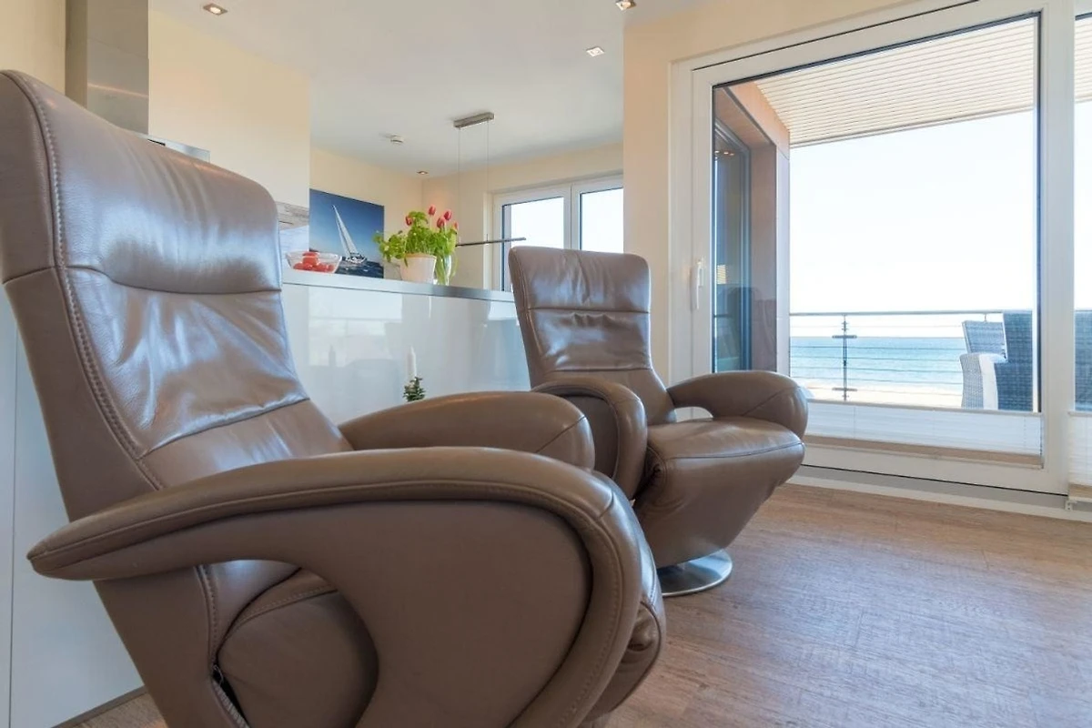 - Hochwertig eingerichteter Wohnbereich mit Relaxsesseln, Kamin (Elektro), Flatscreen-TV, DVD-Player, Hifi-Anlage, WLAN, grossem Massivholzesstisch mit Schwingstühlen, kleiner Bibliothek, ausgewählten Gesellschaftsspielen, Fussbodenheizung und herrlichem Ostseeblick