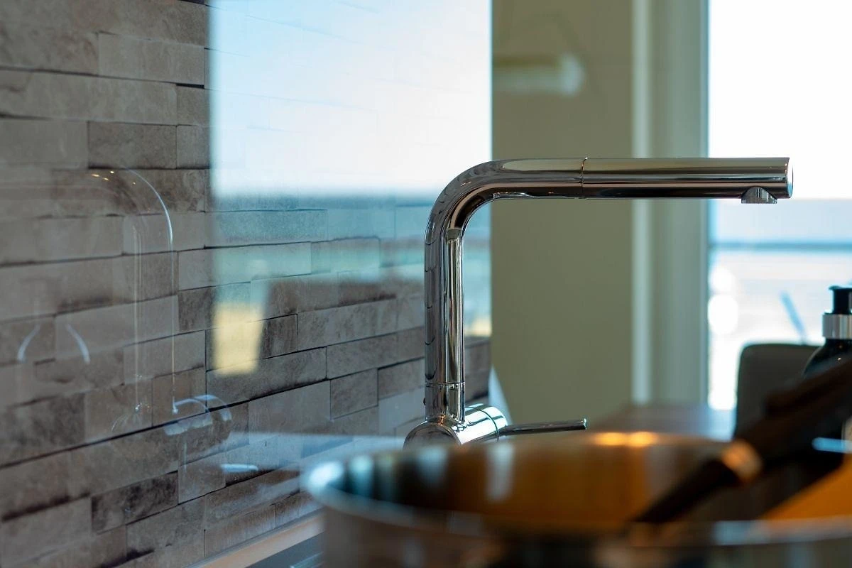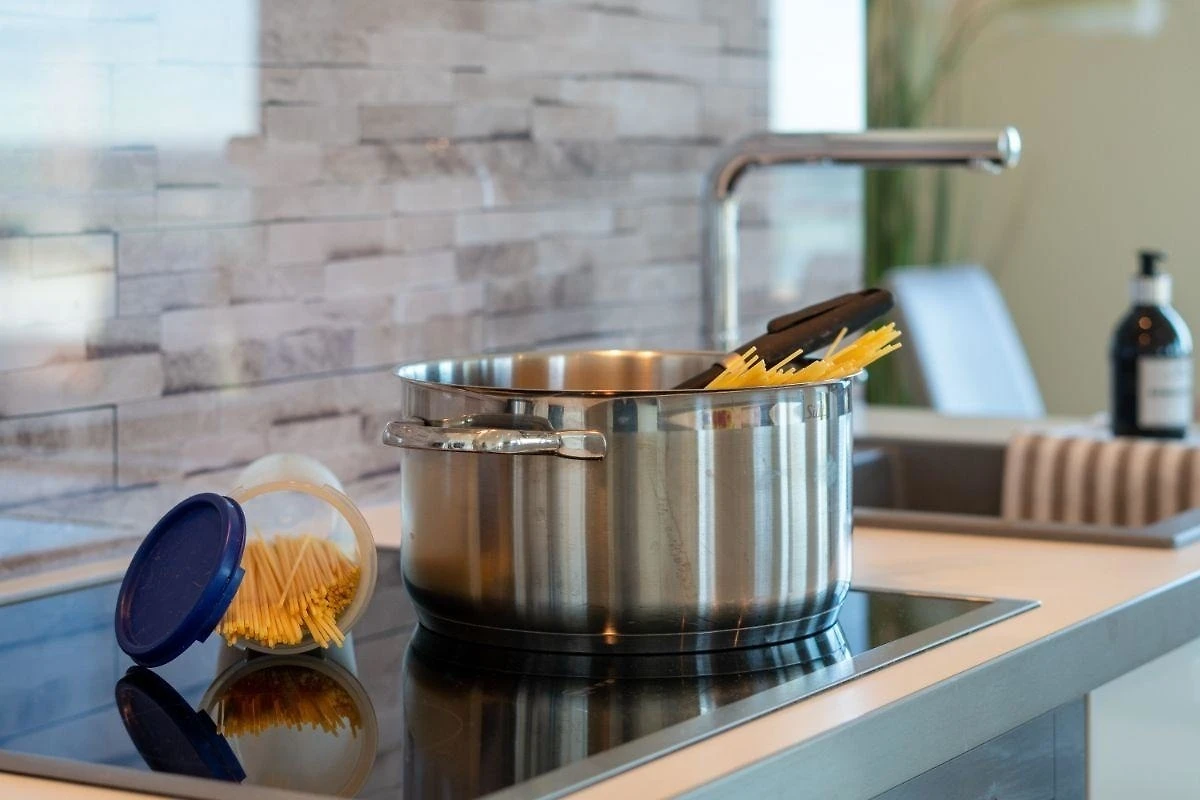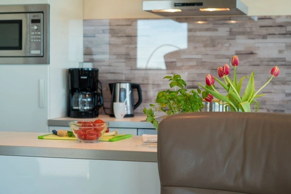 - vollausgestatteter, moderner, offener Kochbereich mit Arbeitsinsel und Markengeräten ( Geschirrspüler, Ceran-Kochfeld, Mikrowelle, Backofen, Dunstabzugshaube, Kaffeemaschine, Kühlschrank mit ***-Gefrierfach, Eierkocher, Wasserkocher, Toaster)