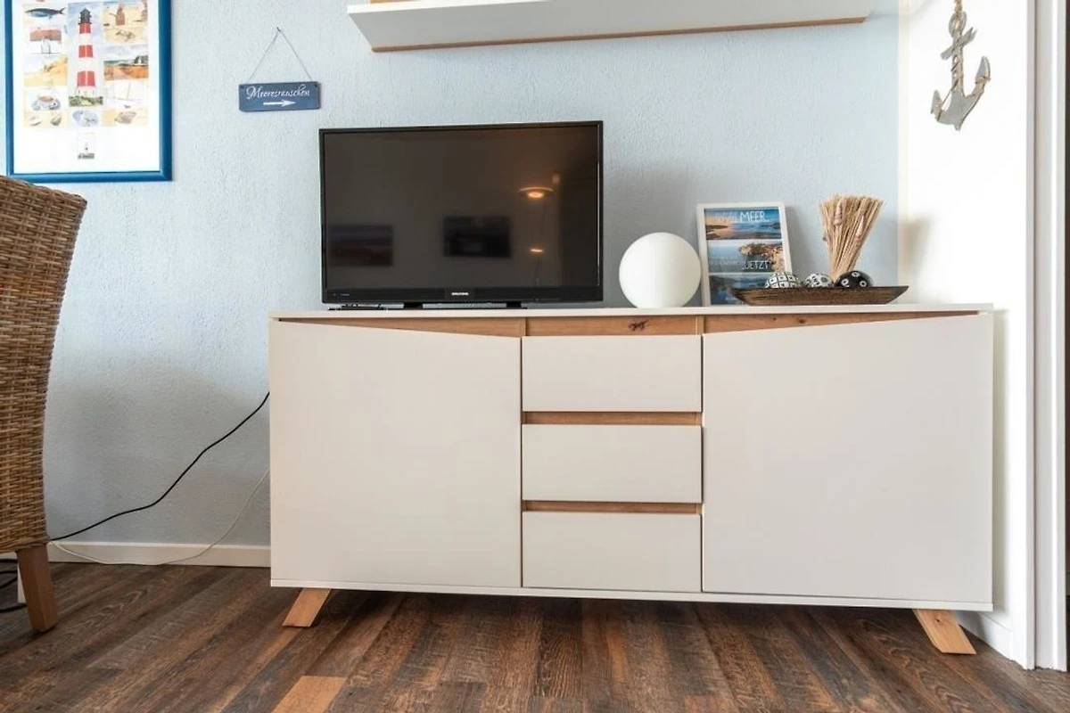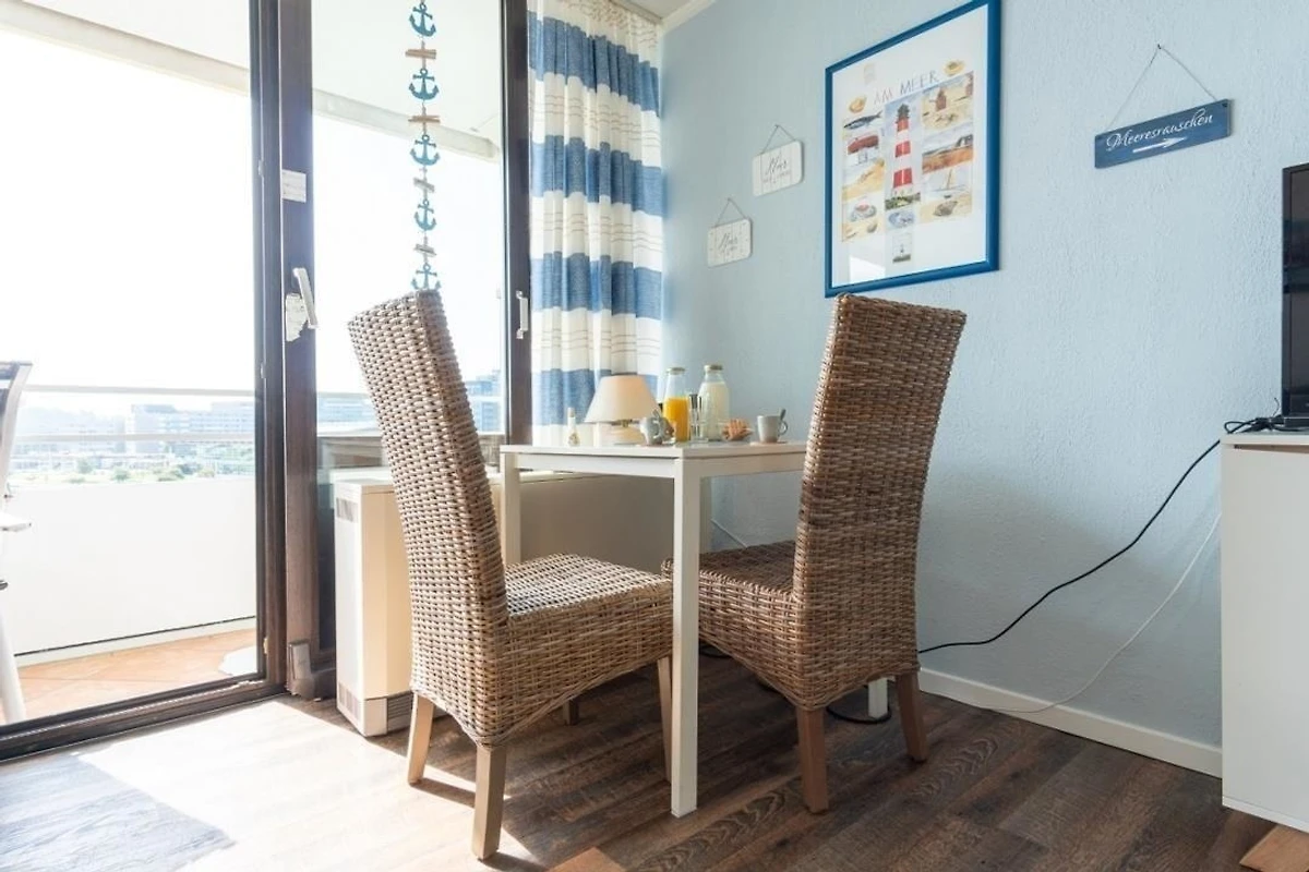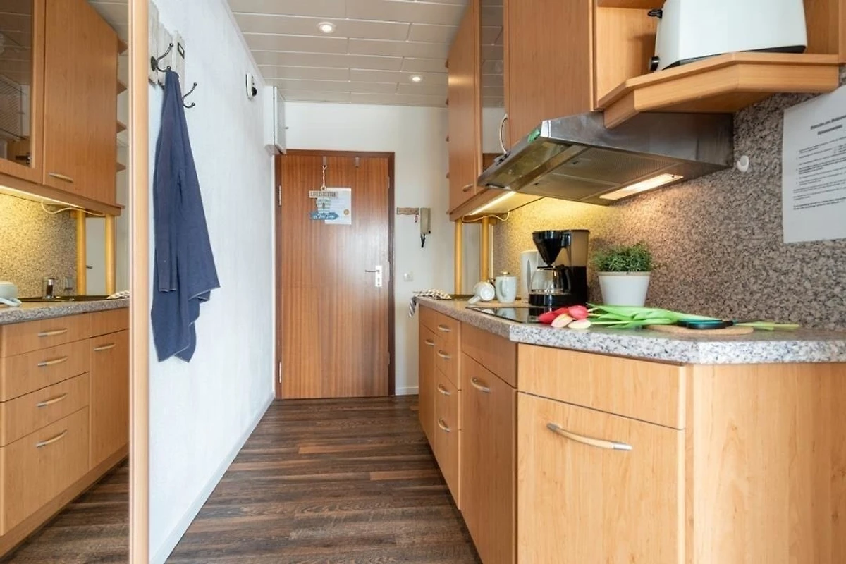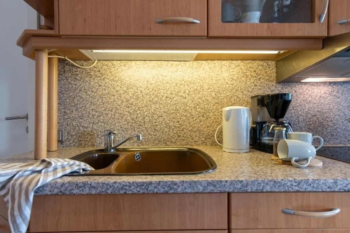 Urlauben Sie auf grosszügigen 36 m² (4. Etage) im Haus "Schöne Aussicht" auf dem Steinwarder - nur wenige Meter vom Badestrand entfernt. Die zuletzt 2020 modernisierte Ferienwohnung verfügt über einen grossen Wohnschlafbereich mit einer gemütlichen Sofaecke und Flatscreen-TV. Im angrenzenden Essbereich finden bequem zwei Personen Platz zum Schlemmen. Der offene Küchenbereich ist, für den Urlaubsbedarf, voll ausgestattet. Eine Kaffeemaschine gehört ebenso dazu, wie ein Wasserkocher und ein Toaster. Geschirr und Besteck sind ausreichend vorhanden.