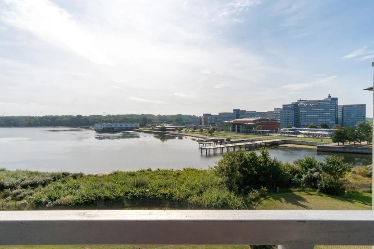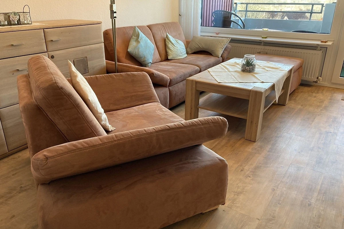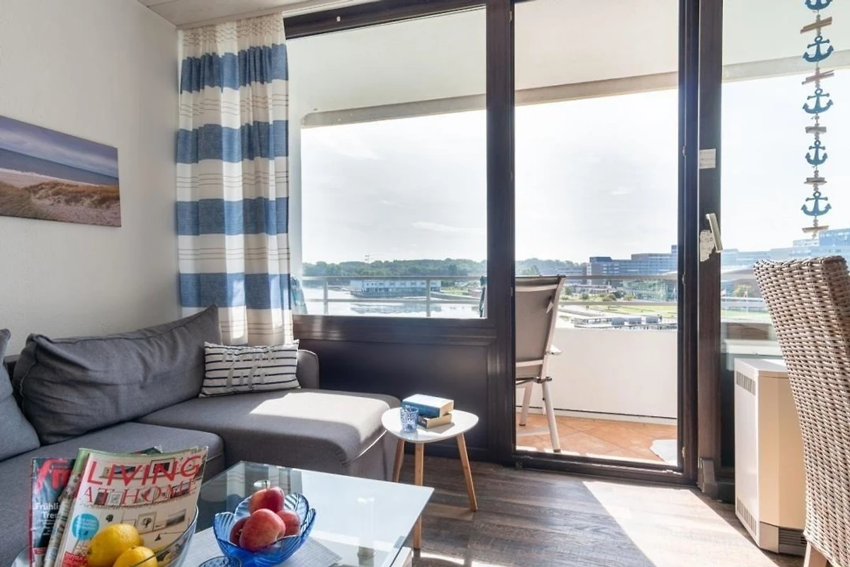 Vom Wohnzimmer aus gelangen Sie auf den Balkon mit Seeblick (Binnensee).
