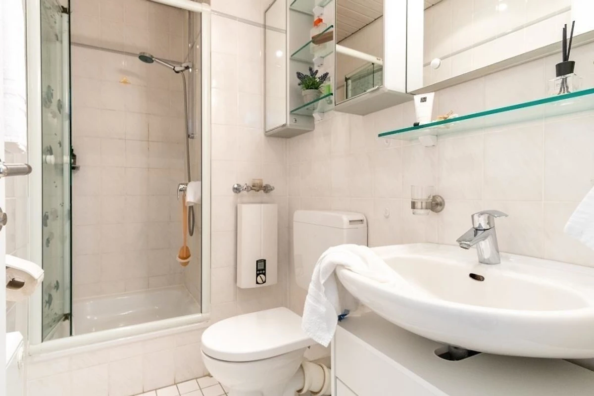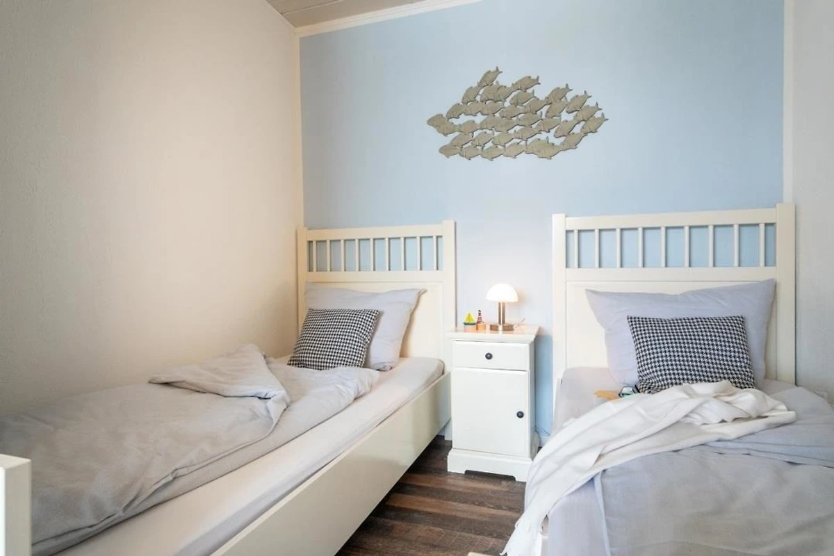 Der Schlafbereich ist mit zwei komfortablen Einzelbetten eingerichtet. Das Badezimmer wurde ebenfalls modernisiert und verfügt über eine Dusche mit Glastrennwand.