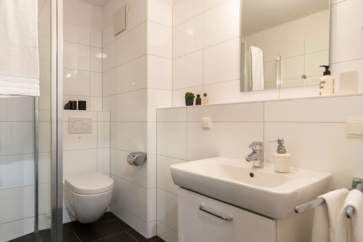 Das Badezimmer verfügt über eine bodengleiche Dusche und Waschmaschine. Im Schlafzimmer finden Sie neben dem bequemen Doppelbett einen geräumigen Kleiderschrank und einen Flatscreen-TV.