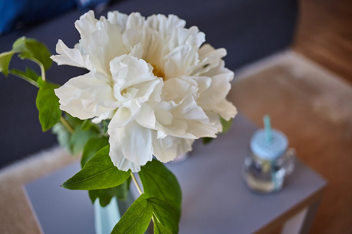 Alle Zimmer befinden sich auf einer Etage. Die abgebildete Treppe im Wohnzimmer führt in private Räume, die nicht genutzt werden und für einen späteren Ausbau der Wohnung gedacht sind.