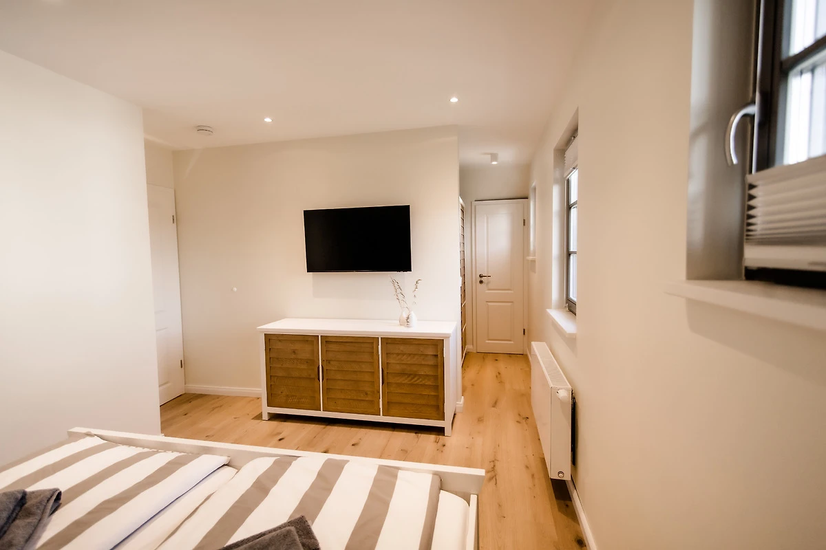 2021 erbaut, liebevoll eingerichtet und dekoriert bietet es auf 102 m² alles, was das Urlauberherz begehrt. Neben zwei geräumigen Schlafzimmern und einem hübschen Kinderzimmer erwarten Sie eine hochwertig ausgestatte Küche, zwei Bäder und eine finnische Sauna*. Kuschelige Stunden verlebt ihr im gemütlichen und lichtdurchfluteten Wohnzimmer mit Blick zum prasselnden Kaminfeuer (Gaskamin). In den Sommermonaten lässt sich der Abend unterm Sternenzelt mit einem Glas Wein auf der Terrasse/ im Garten geniessen. Für die Kinder halten wir neben zahlreichen Spielsachen auch allerlei Praktisches** bereit. Und das Beste: der wunderschöne Ostseestrand als auch der Boden/Hafen liegen direkt vor der Haustür und laden Euch zu einer erlebnisreichen Fahrrad- oder Wandertour ein. Die Nutzung der Fahrräder (2), der Sauna und der Waschmaschine sind inklusive, 2 Stellplätze und ein abschliessbarer Schuppen mit 2 Fahrräder sind auf dem Grundstück vorhanden.