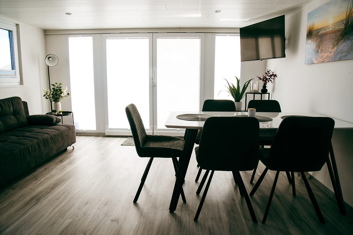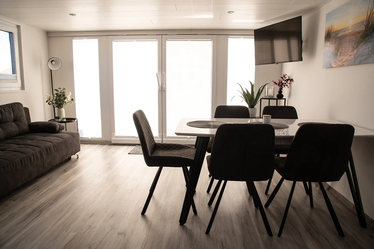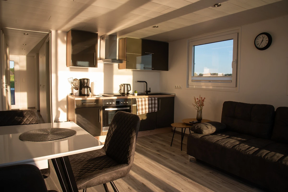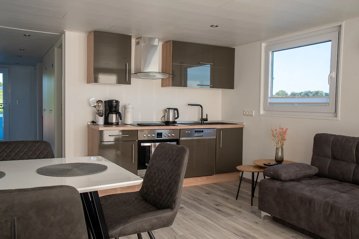Das haben alle Boote gemeinsam: eine volleingerichtete Küche mit Herd, Backofen, Mikrowelle, Kaffeemaschine, Toaster, etc.. Dank der grossen Fensterfront haben Sie sowohl vom Sofa als auch vom Esstisch immer einen schönen Ausblick auf das Wangermeer.