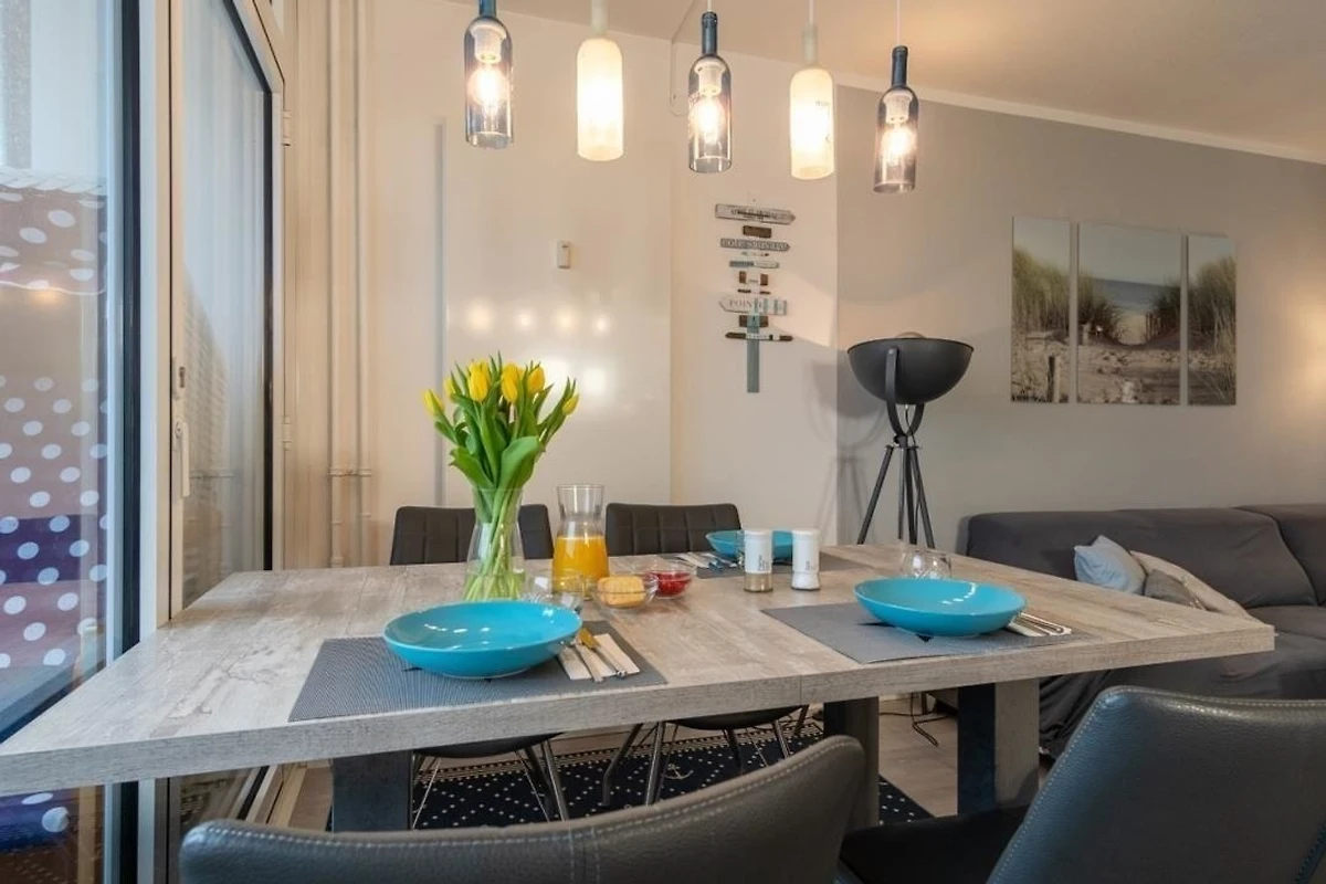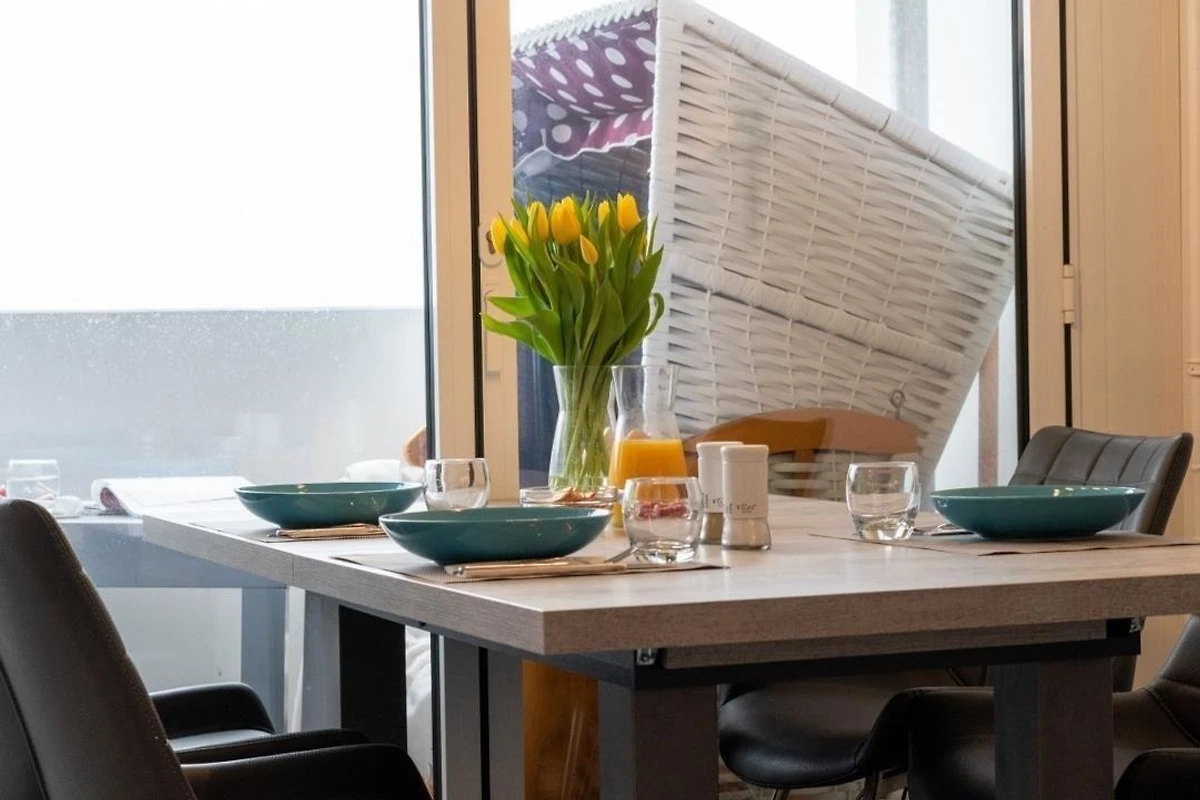 Der grosszügige Wohnbereich verfügt über ein gemütliches Ecksofa, einen Flatscreen-TV und vieles mehr. Vom Essbereich aus kann man schon beim Frühstück den herrlichen Ausblick zur Ostsee - bis hin zur Fehmarnsundbrücke - geniessen.
