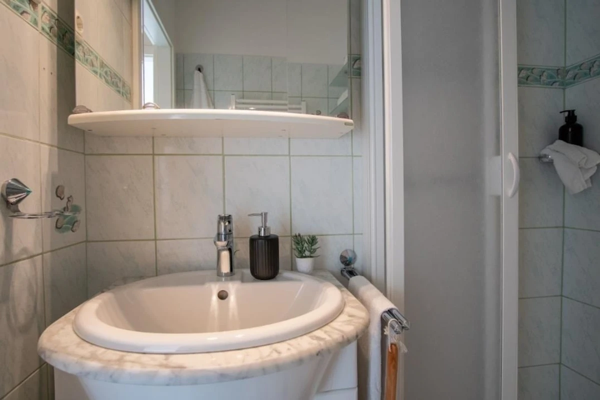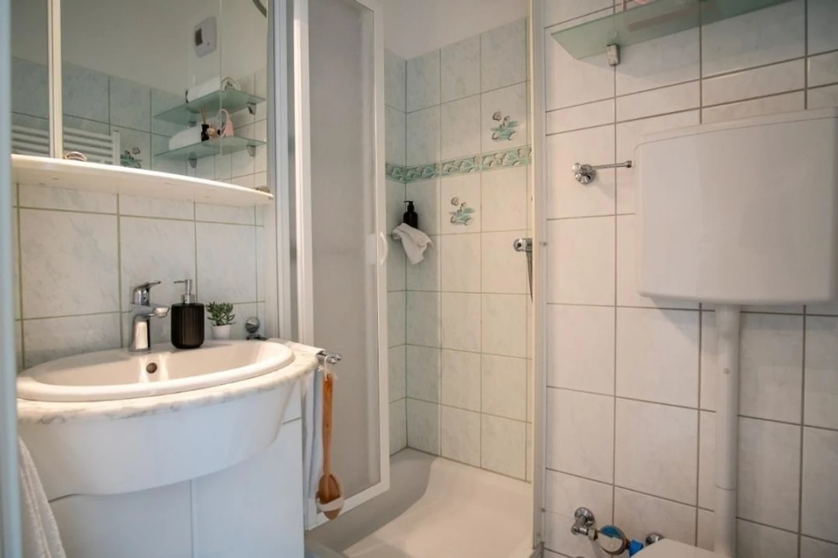 Das Badezimmer ist ebenfalls komplett modernisiert: die Dusche verfügt über einen leicht erhöhten Einstig und ist mit einer Glaskabine ausgestattet.