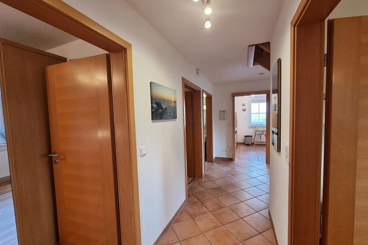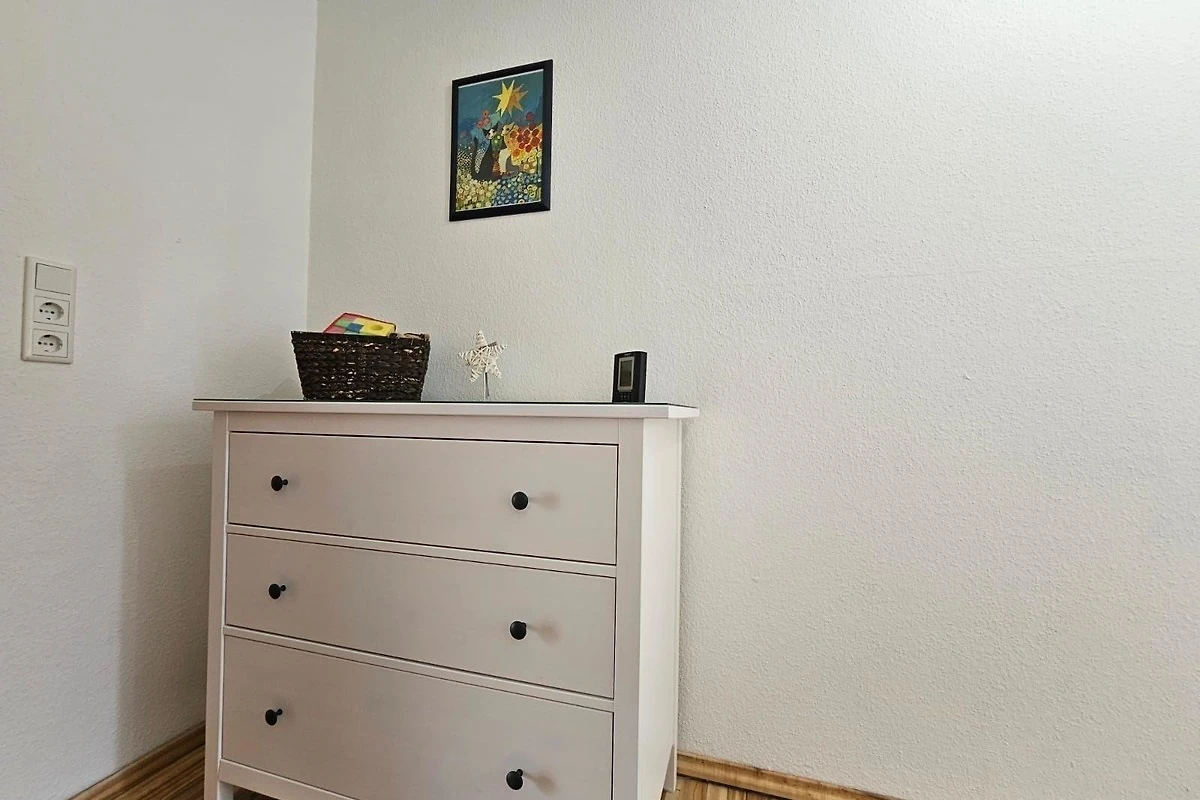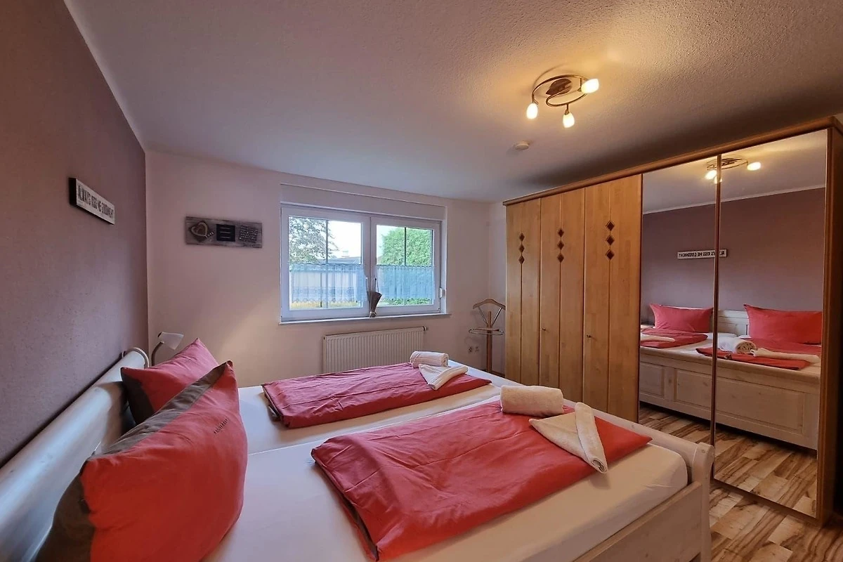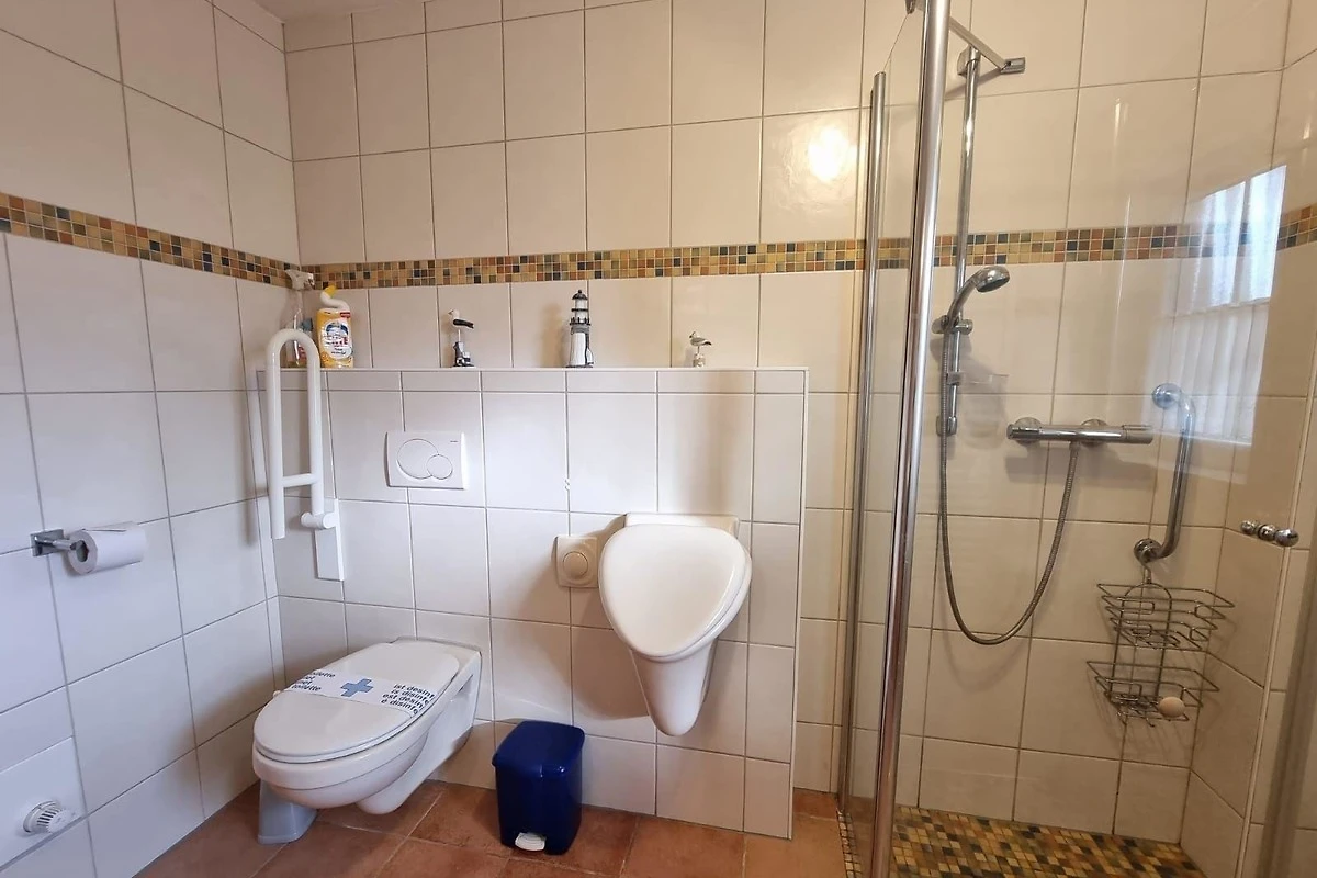 Die Ferienwohnung bietet eine hervorragende Ausstattung und viel Platz für individuelle Bedürfnisse. Sie verfügt über drei Schlafzimmer: eines mit einem gemütlichen Doppelbett und zwei weitere mit jeweils einem Einzelbett. Das Badezimmer ist mit einer bodengleichen Dusche und einem Fenster ausgestattet, ergänzt durch einen Kosmetikspiegel und ein Starterset mit Pflegeprodukten.