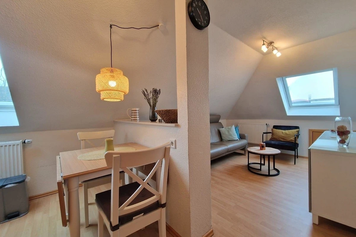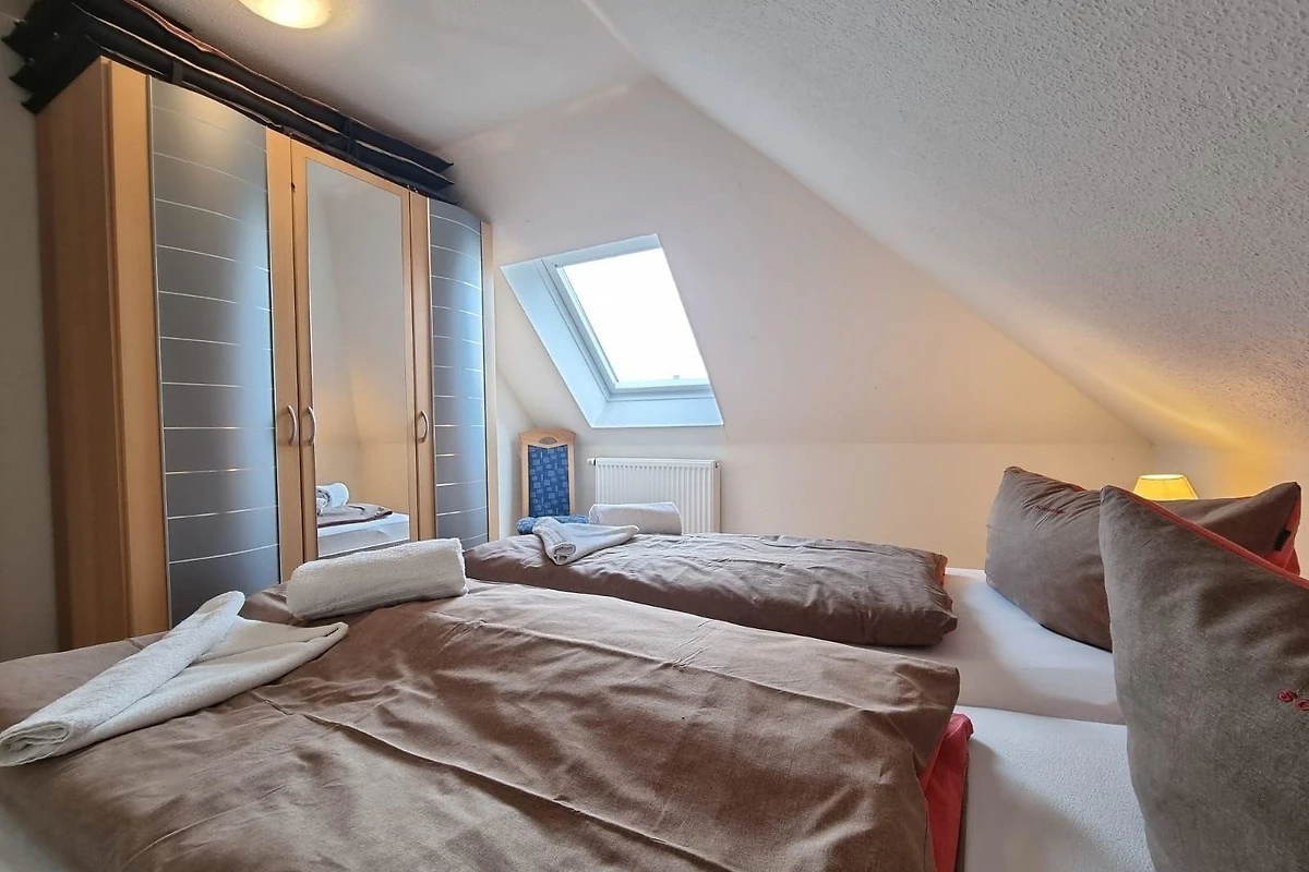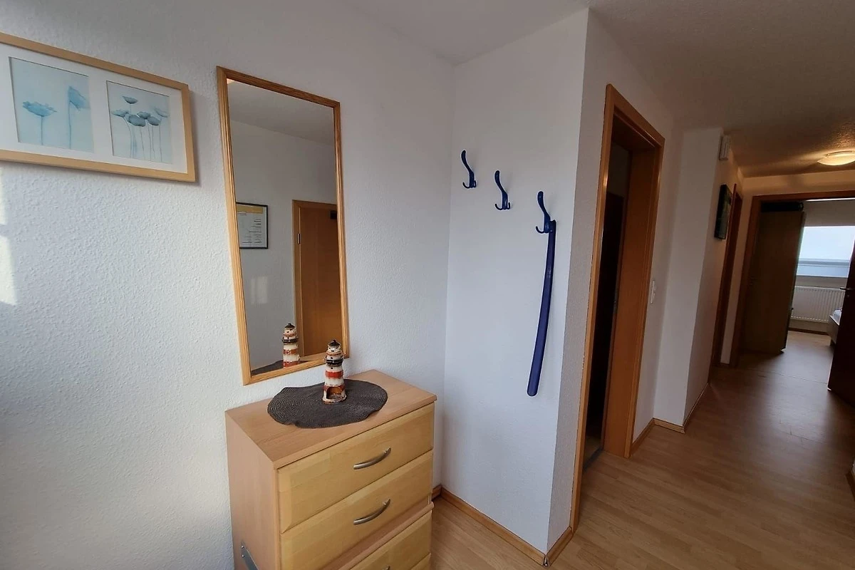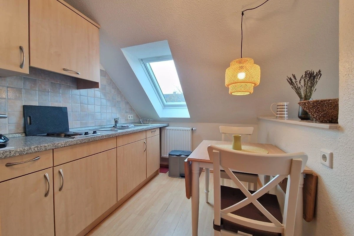 Die Ferienwohnung besticht durch ihre moderne Ausstattung und einladende Räume. Sie verfügt über zwei Schlafzimmer, darunter ein Doppelbett und ein Einzelbett, ideal für Familien oder Kleingruppen. Die offene Küche ist mit einem Elektro-/Gasherd, Geschirrspüler, Backofen, Mikrowelle und Kühlschrank ausgestattet, um alle Bedürfnisse zu erfüllen. Ein Esstisch lädt zu gemeinsamen Mahlzeiten ein. Das Allergikergeeignete Ambiente bietet zudem einen Hochstuhl für Kinder und ein Duschbad mit einem Fenster, einem Haartrockner sowie einem Starterset für die persönliche Hygiene. Ein gemütliches Wohnzimmer mit Sofa, Sessel und HiFi-Anlage garantiert entspannte Stunden. Zur technischen Ausstattung gehören WLAN und TV. Praktische Extras wie Parkplatz, Bügeleisen, Staubsauger und Reinigungsmittel sorgen für zusätzlichen Komfort. Die Lage mit Sonnenschirm und Garderobe rundet das Angebot ab. Diese Wohnung ist der perfekte Rückzugsort für entspannte Urlaubstage.