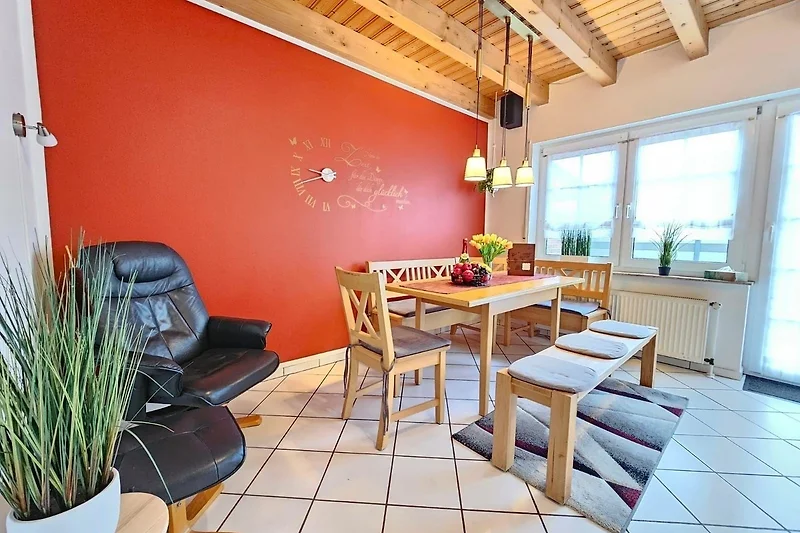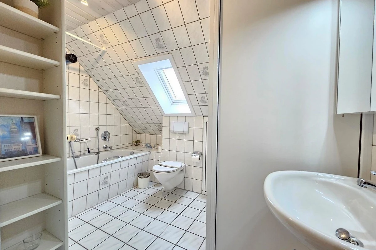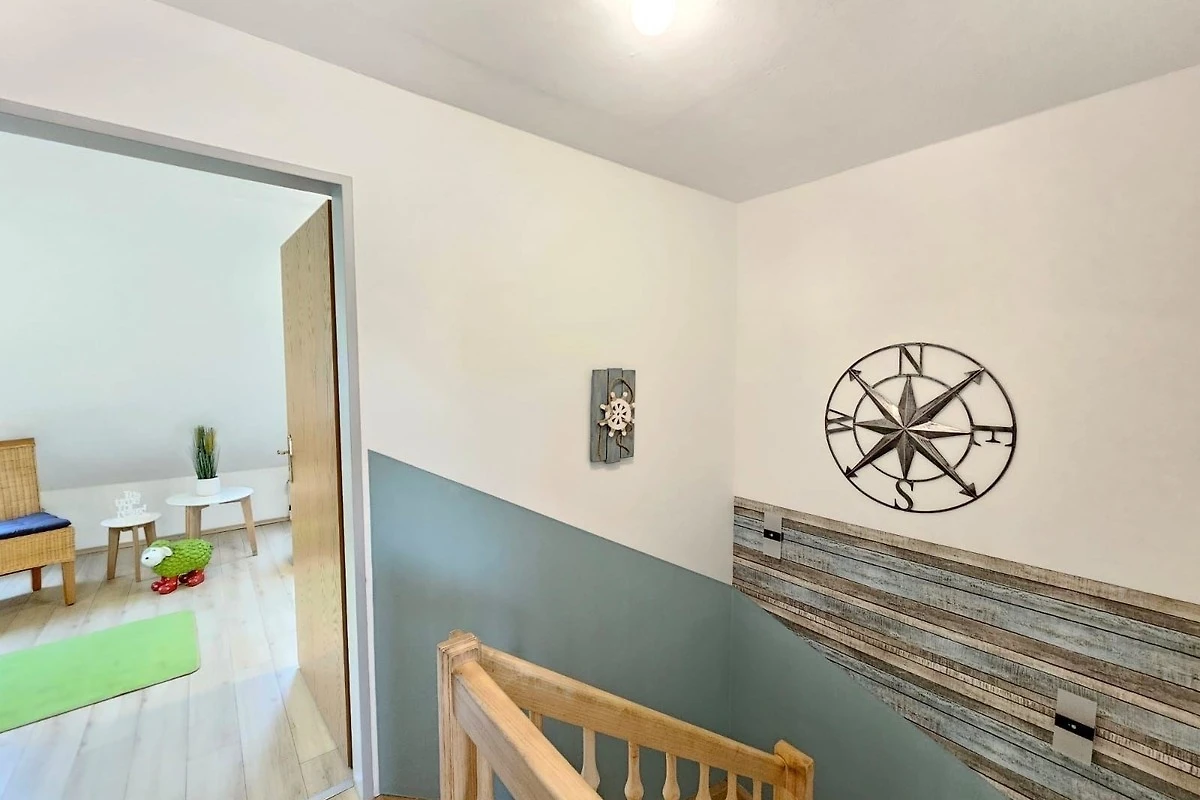 Das Badezimmer mit Fenster bietet eine Badewanne sowie ein Duschbad und ist durch zusätzliche Annehmlichkeiten wie Haartrockner und Kosmetikspiegel perfekt ausgestattet. Zudem sind ein Gäste-WC und eine Waschmaschine vorhanden. Der Wohnbereich mit Sofa, Sessel und Esstisch lädt zum Verweilen ein. WLAN sorgt für Internetverbindung, während Einrichtungen wie Treppenschutz und Allergikergeeignetheit für zusätzlichen Komfort sorgen. Das Starterset mit Pflegeprodukten rundet das Angebot ab und macht den Aufenthalt besonders angenehm.