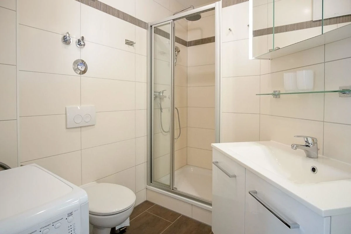 Das Wellnessbad präsentiert sich neben der Dusche mit Kabine. Ausserdem steht Ihnen hier noch eine Waschmaschine zur kostenfreien Verfügung.