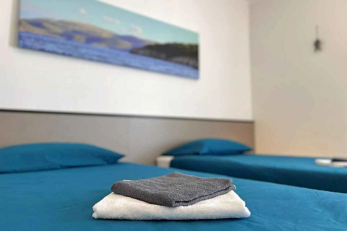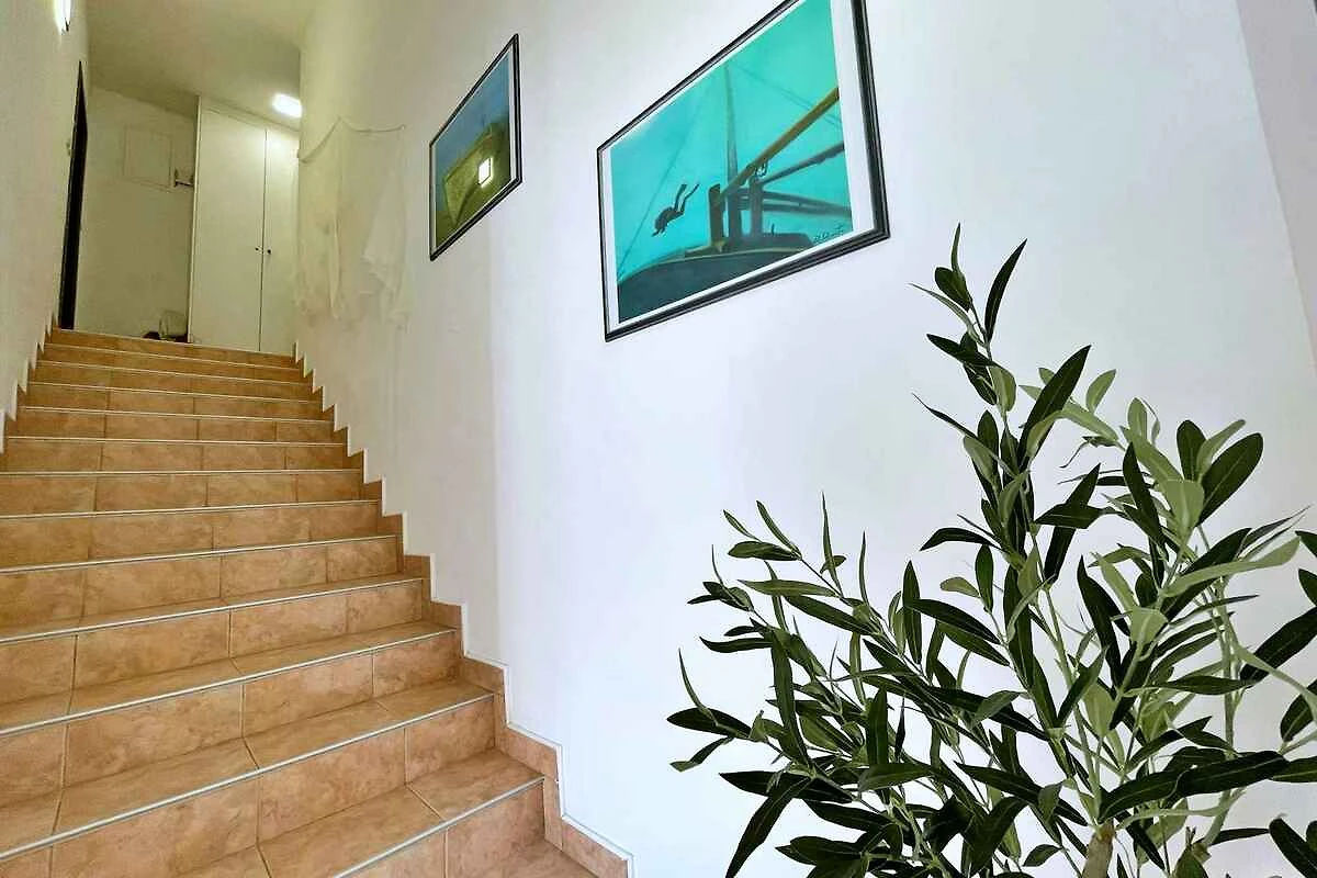 und führt über eine Innentreppe direkt in den Flur mit Türen zu allen Räumen. Wohnzimmer mit 1 Zusatzbett auf Couch/Sofa, Sitzecke, TV, Klimaanlage, Essecke und Zugang zum Balkon (10 qm, überdacht, Gartenmöbel). Schlafzimmer mit 2 Einzelbetten. Schlafzimmer mit 1 Doppelbett. Kochecke im Wohnzimmer mit Klimaanlage, Elektroherd (Cerankochfeld), Dunstabzugshaube, Kühlschrank (Eisfach), Kaffeemaschine, Toaster und elektrischem Wasserkocher. Bad mit Dusche, 1 Waschbecken, WC und Fenster.