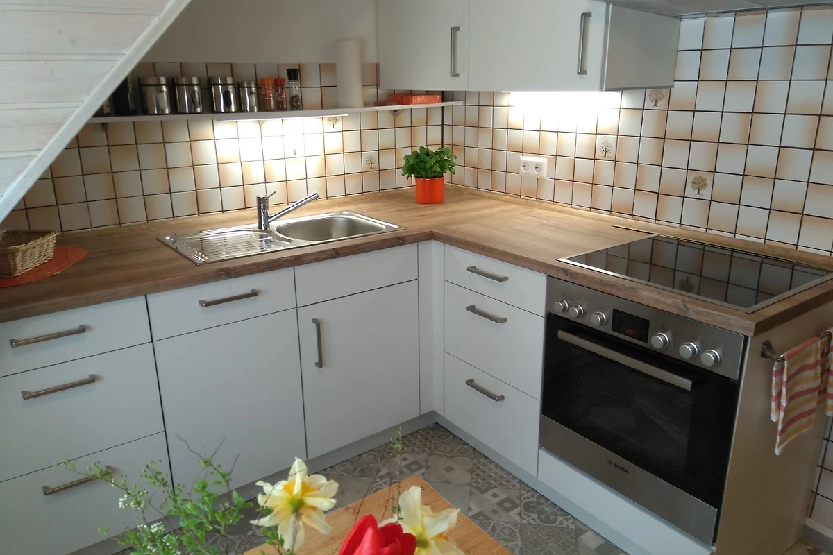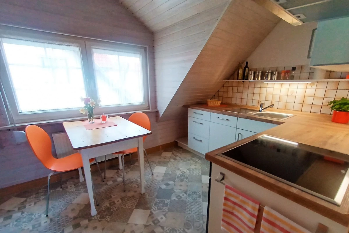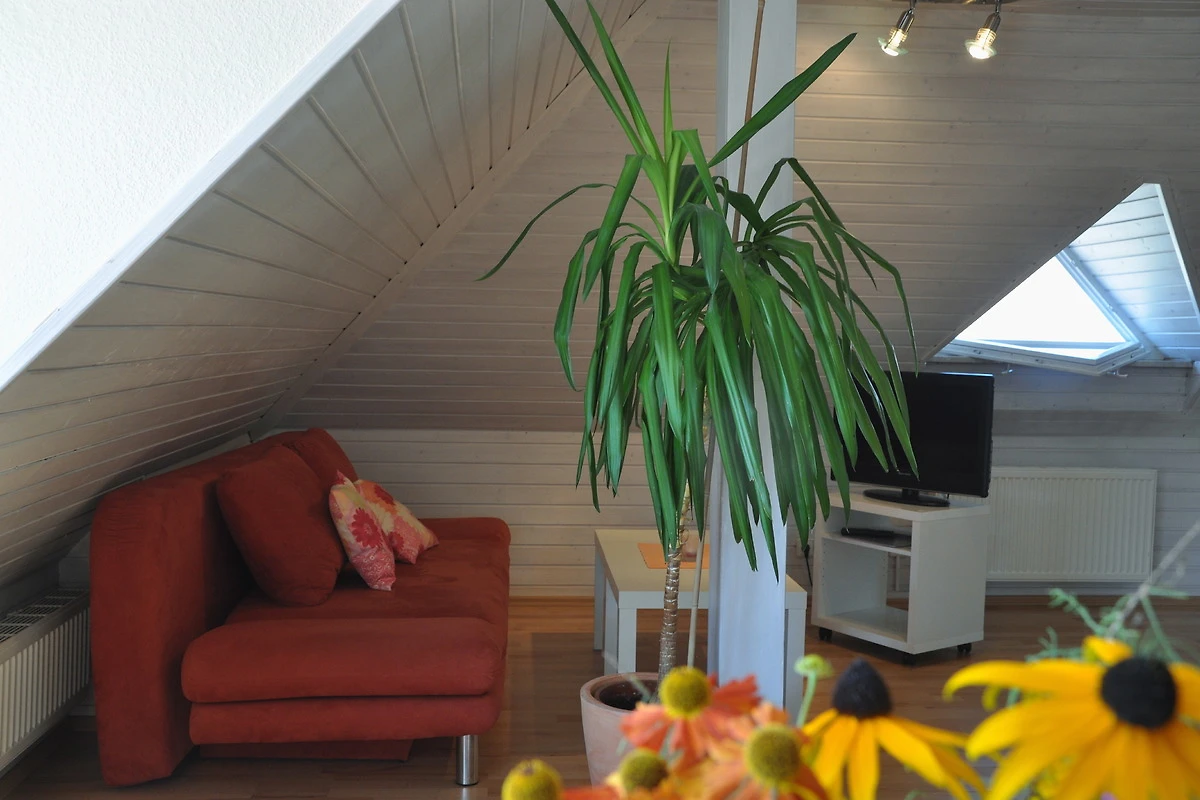 Sonnige, freundliche und gut ausgestattete Dachgeschoss-Wohnung (42 qm) in zentraler und ruhiger Lage in Fischbach (westlicher Ortsteil von Friedrichshafen). Sie bietet Ihnen ein grosses Wohnzimmer mit einem schönen Essplatz und einer gemütlichen Sofaecke. Zusätzlich gibt es eine neu renovierte Wohnküche, ein kleines Bad (neu renoviert) und ein getrenntes WC. Ein separates Schlafzimmer mit grossem Doppelbett.