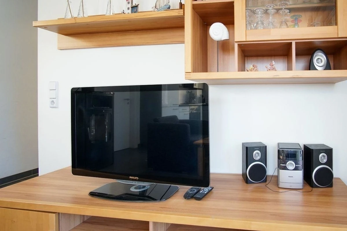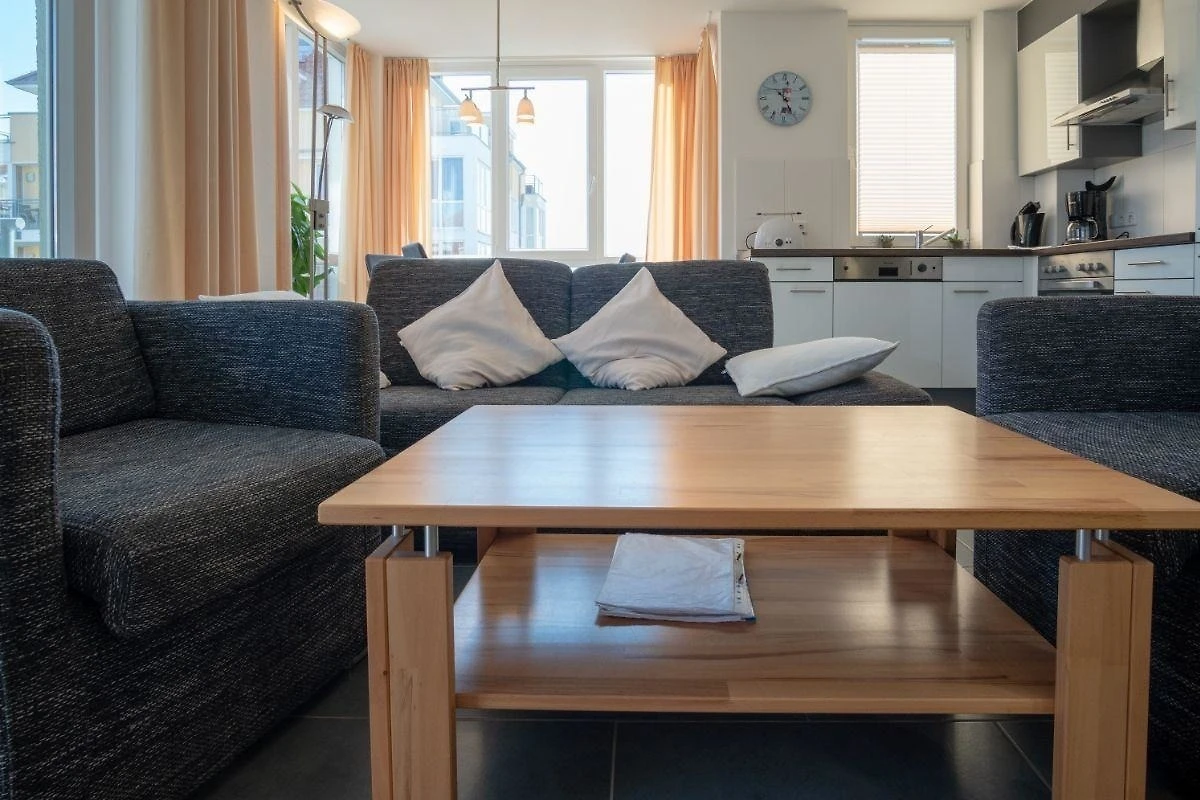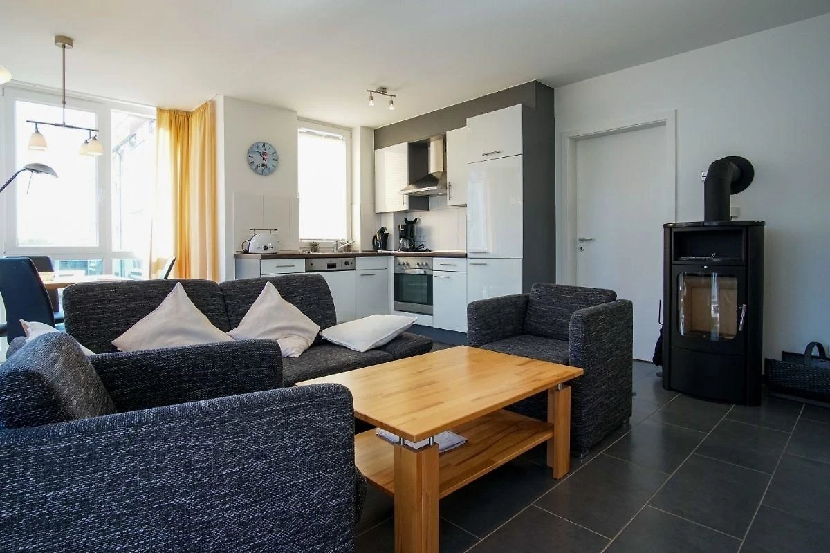 Die 51 qm-Wohnung befindet sich in der 1. Etage in der Anlage "Strandpark". Der lichtdurchflutete Wohnbereich, mit direktem Zugung zum Ostbalkon, ist mit einer gemütlichen Sofaecke, TV, Spielen, einem Kaminofen u.v.m. ausgestattet. Der offene Küchenbereich ist, für den Urlaubsbedarf, voll ausgestattet. Eine Kaffeemaschine gehört ebenso dazu, wie der Wasserkocher und ein Toaster. Geschirr und Besteck sind ausreichend vorhanden. Ausserdem stehen Ihnen noch ein Backofen und ein Geschirrspüler zur Verfügung. Vier Personen finden in zwei getrennten Schlafräumen ausreichend Platz: das Elternschlafzimmer verfügt über ein Doppelbett (ca. 160x200cm), das Kinderschlafzimmer hält ein robustes Etagenbett (2x ca. 90x190cm) für Sie vor.