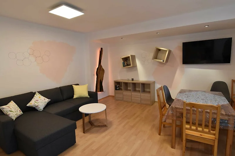 Das Bad ist mit einer Regenschauerdusche, einem Waschbecken und einer Toilette ausgestattet. Das Wohnzimmer mit einem grossen LCD-Fernsehgerät sowie einem Schlafsofa bildet zusammen mit der Küche und dem integrierten Essbereich einen grossen Wohnraum.