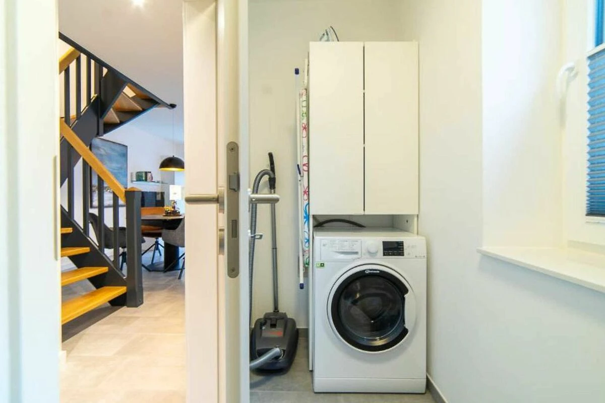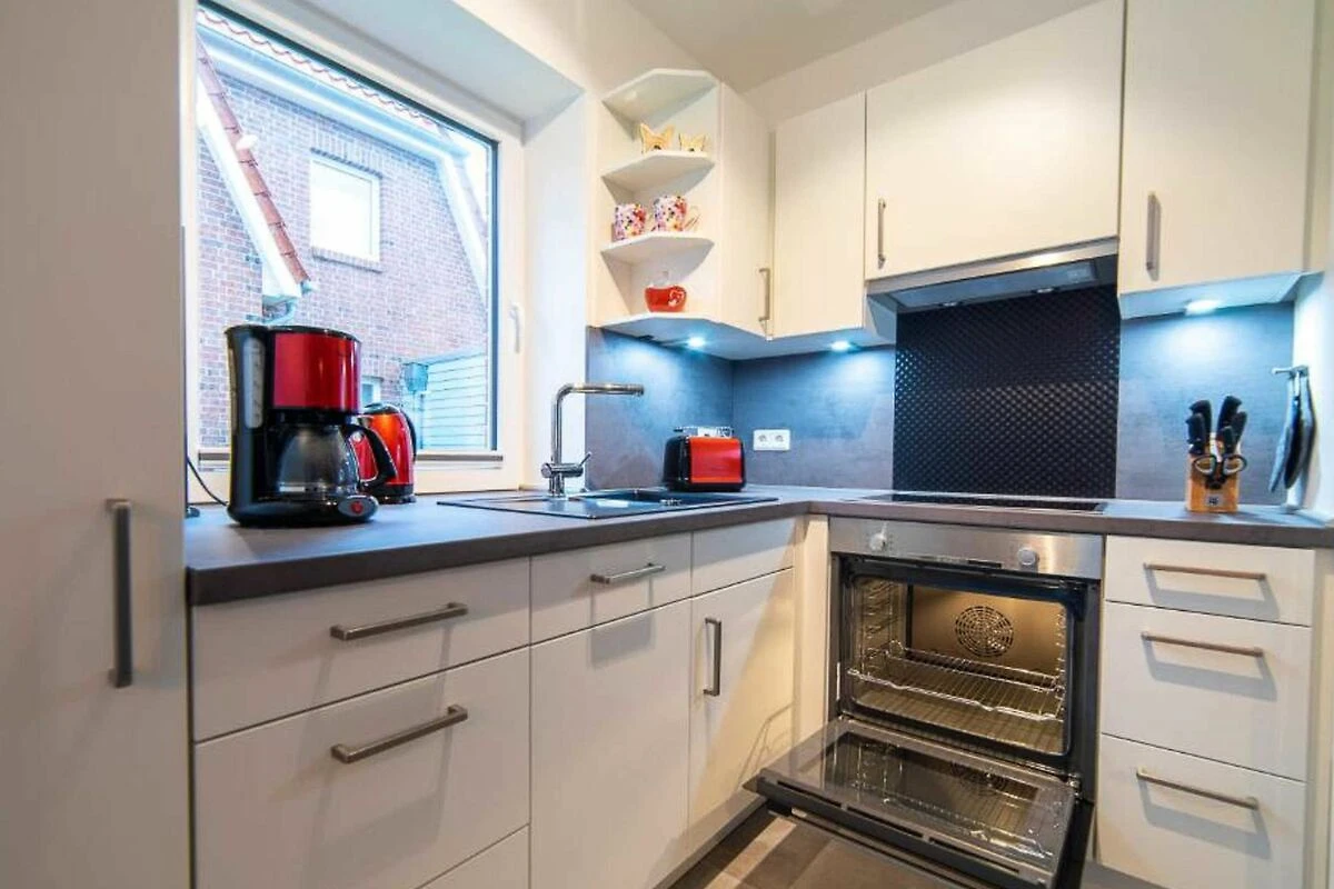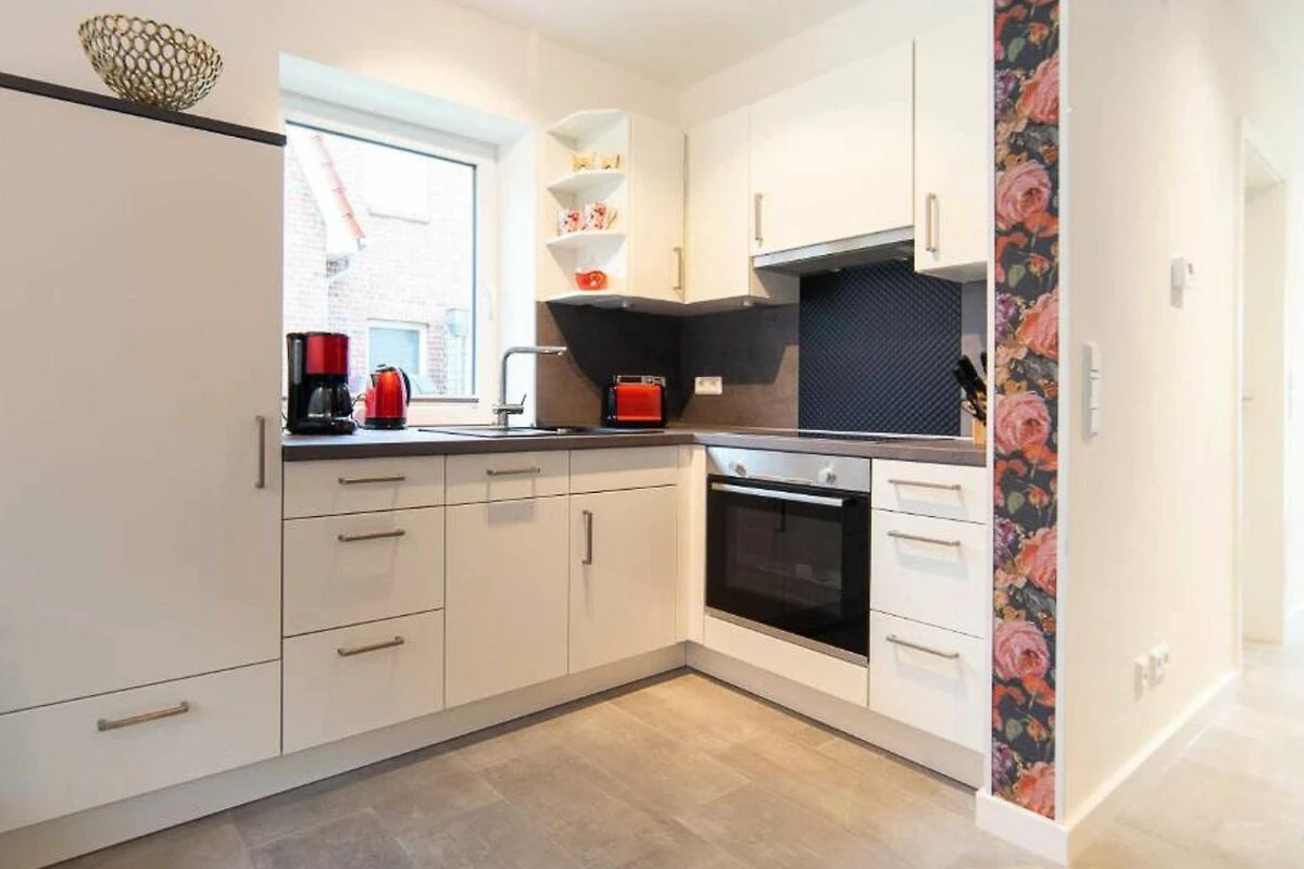 Die Küche bietet mit ihrer kompletten Ausstattung u.a. mit Spülmaschine, Kühl- Gefrierschrank-Kombi, Kaffeemaschine, Toaster, Wasserkocher und Mixer alle Annehmlichkeiten der Selbstversorgung. Der Hauswirtschaftsraum verfügt über Waschtrockner, Bügeleisen, Bügelbrett, Wäscheständer und Staubsauger. Hier ist auch ein Erste Hilfe Kasten untergebracht.