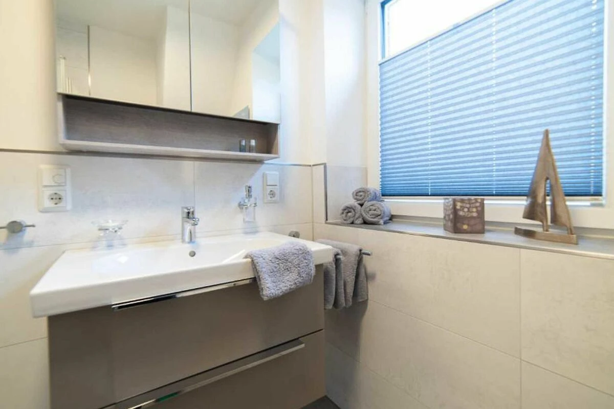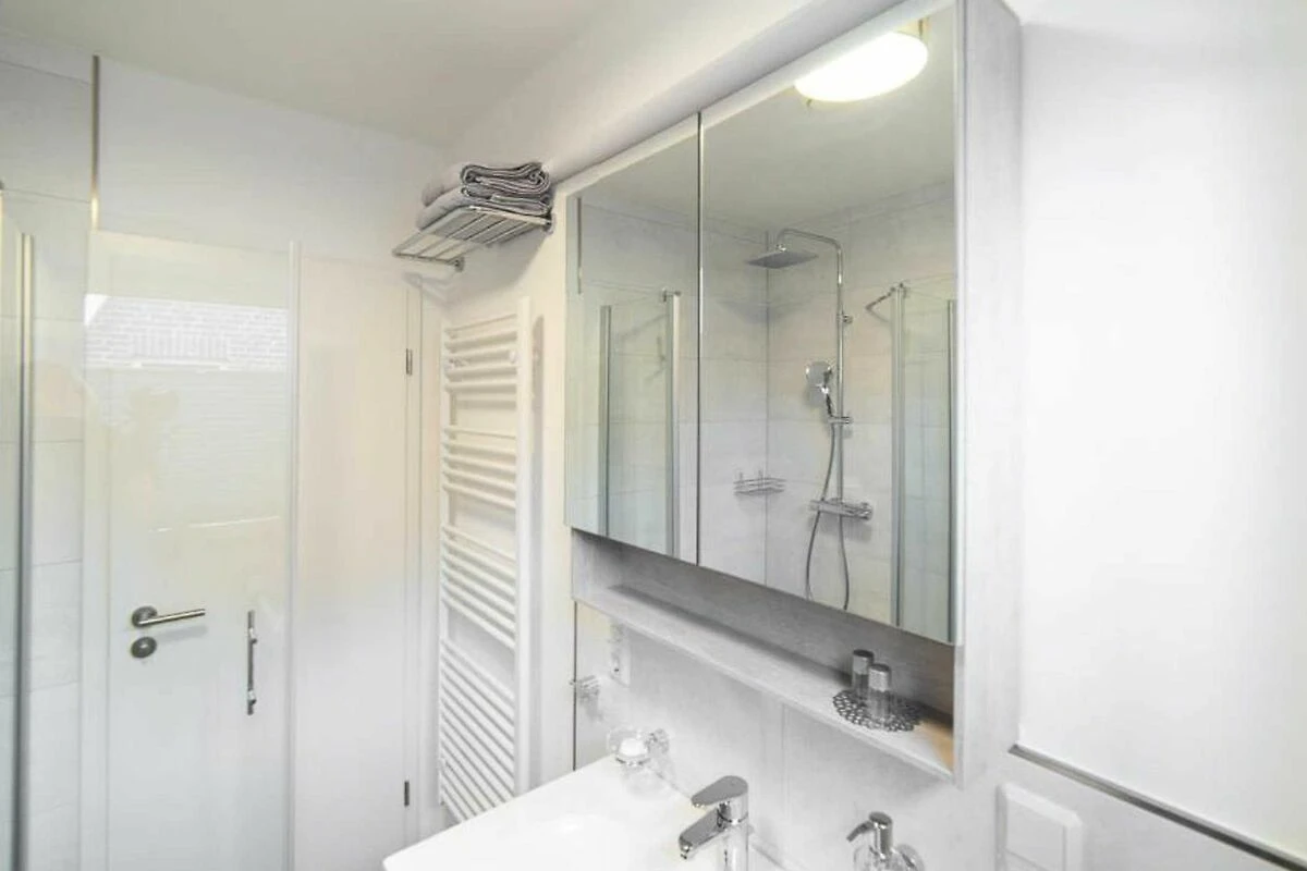 Auf jeder Etage befindet sich ein modernes Badezimmer mit bodengleicher Regendusche, Spiegelschränken, Schminkspiegel, Föhn, Handtuchheizkörper und vielfältigen Ablagemöglichkeiten. Die Fussbodenheizung im gesamten Haus sorgt für angenehme Raumtemperaturen.