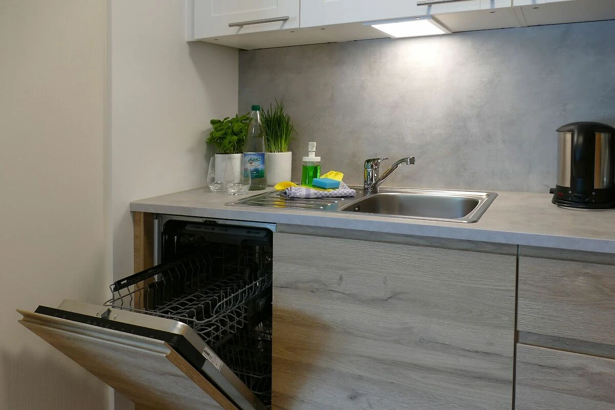 Küche mit 2-Platten-Herd, Geschirrspüler, Kühlschrank, Kaffeemaschine, Wasserkocher, Geschirr u. Besteck u.v.m.