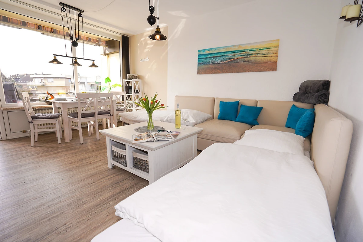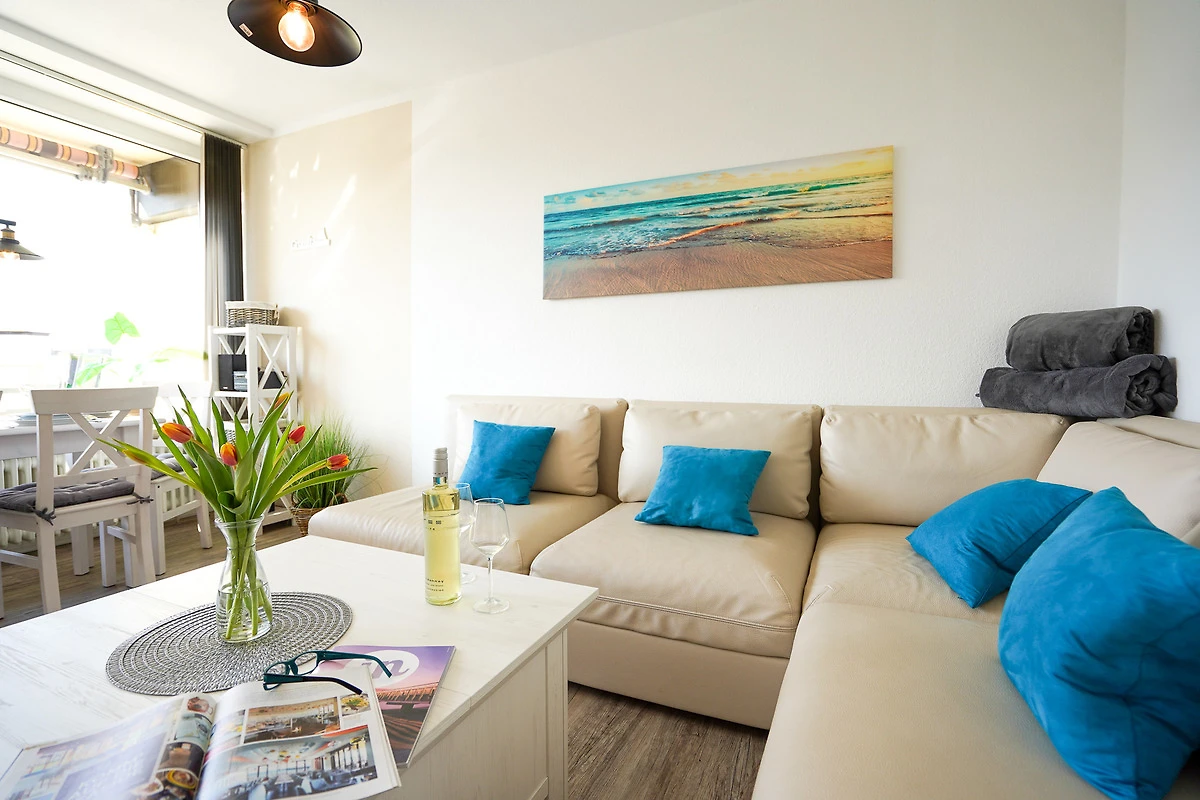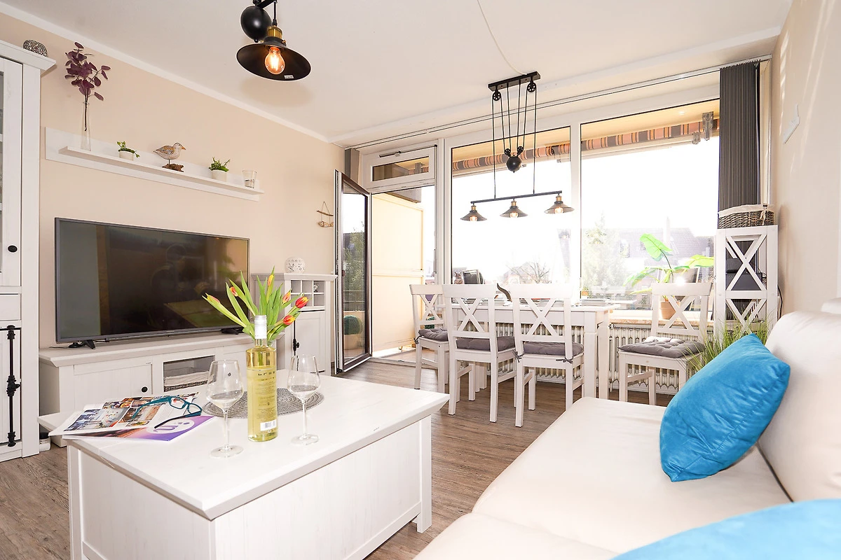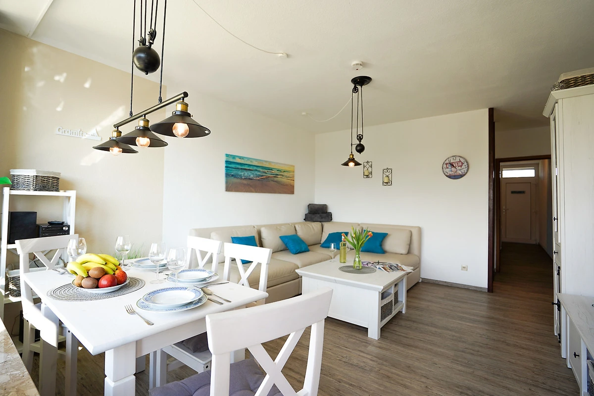 Den Mittelpunkt der Wohnung bildet der lichtdurchflutete, kombinierte Wohn-/Essbereich mit direktem Balkonzugang. Hier lässt es sich auf dem grosszügigen Sofa auch an Regentagen gemütlich machen. Ein grosser Flachbildfernseher, DVD-Player und eine Stereoanlage sorgen für Unterhaltung. W-LAN ist hier selbstverständlich kostenlos vorhanden. Das Sofa lässt sich abends bei Bedarf mit wenigen Handgriffen leicht in eine Schlafstätte verwandeln.