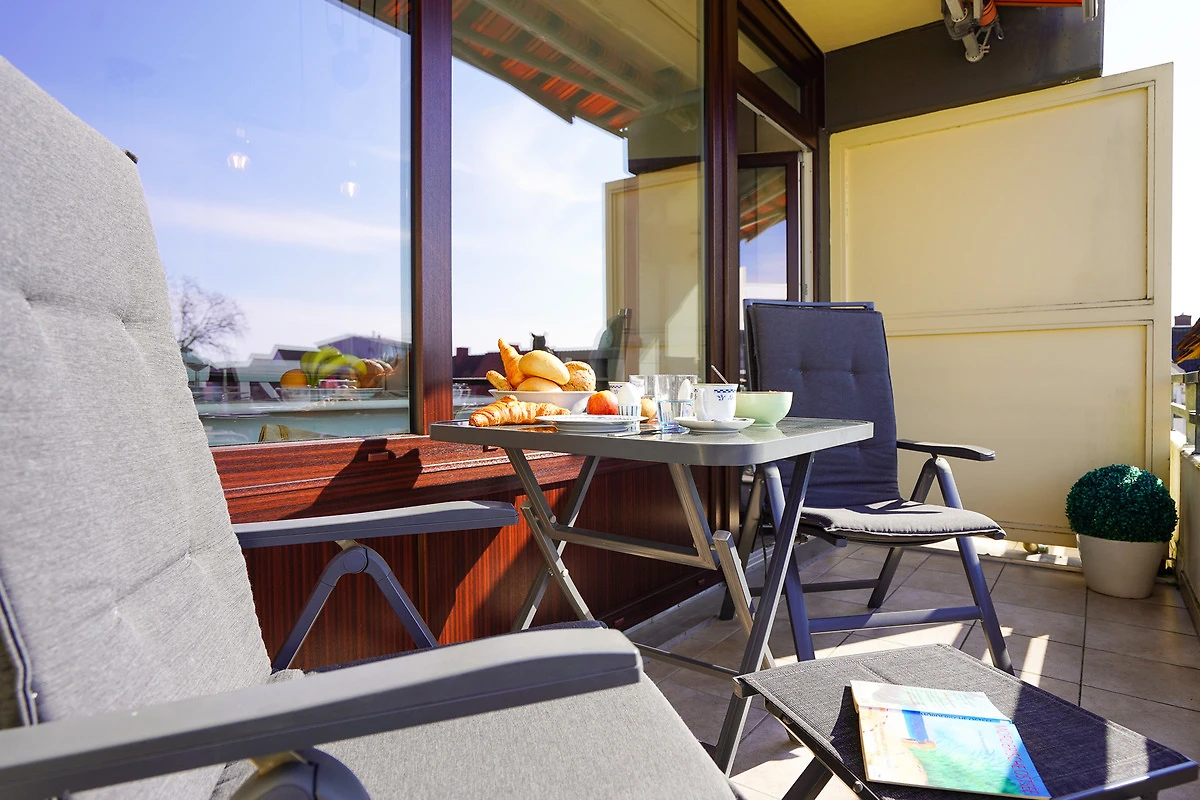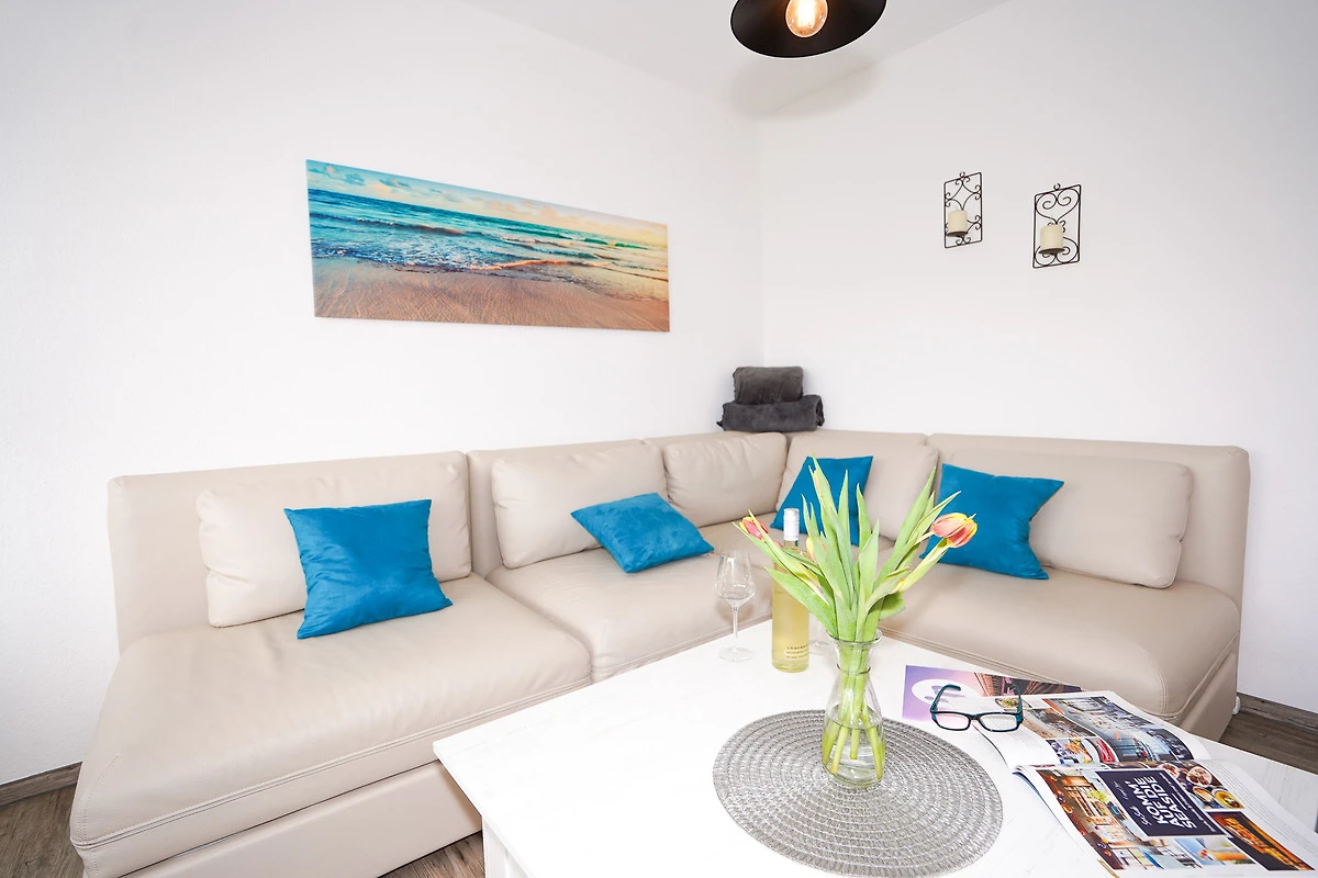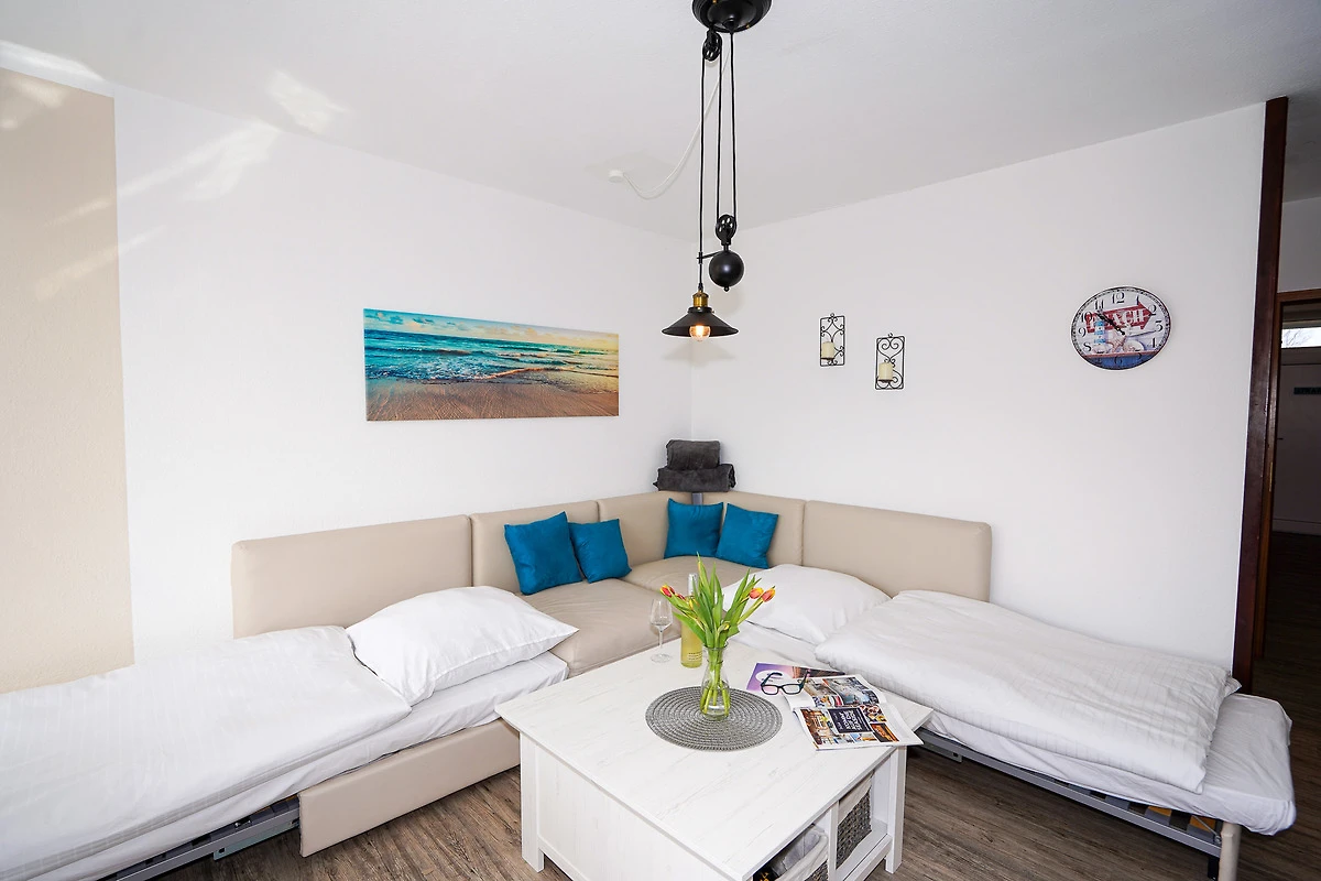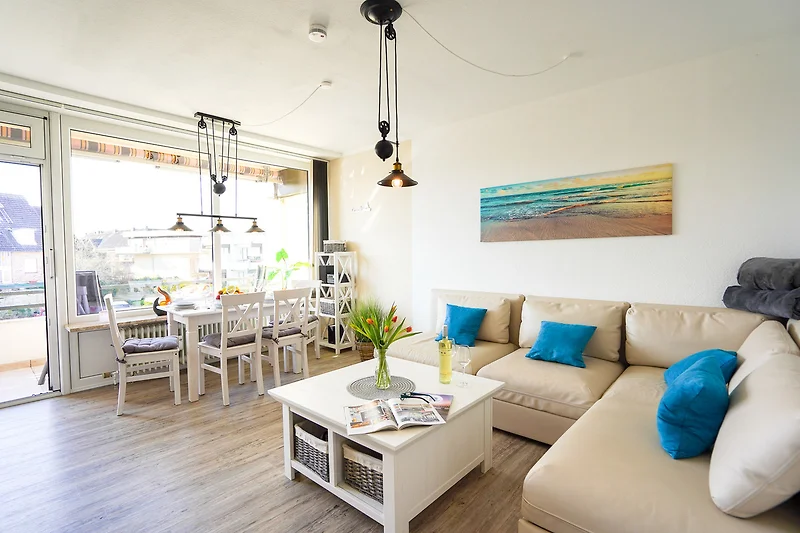 Den Mittelpunkt der Wohnung bildet der lichtdurchflutete, kombinierte Wohn-/Essbereich mit direktem Balkonzugang. Hier lässt es sich auf dem grosszügigen Sofa auch an Regentagen gemütlich machen. Ein grosser Flachbildfernseher, DVD-Player und eine Stereoanlage sorgen für Unterhaltung. W-LAN ist hier selbstverständlich kostenlos vorhanden. Das Sofa lässt sich abends bei Bedarf mit wenigen Handgriffen leicht in eine Schlafstätte verwandeln.