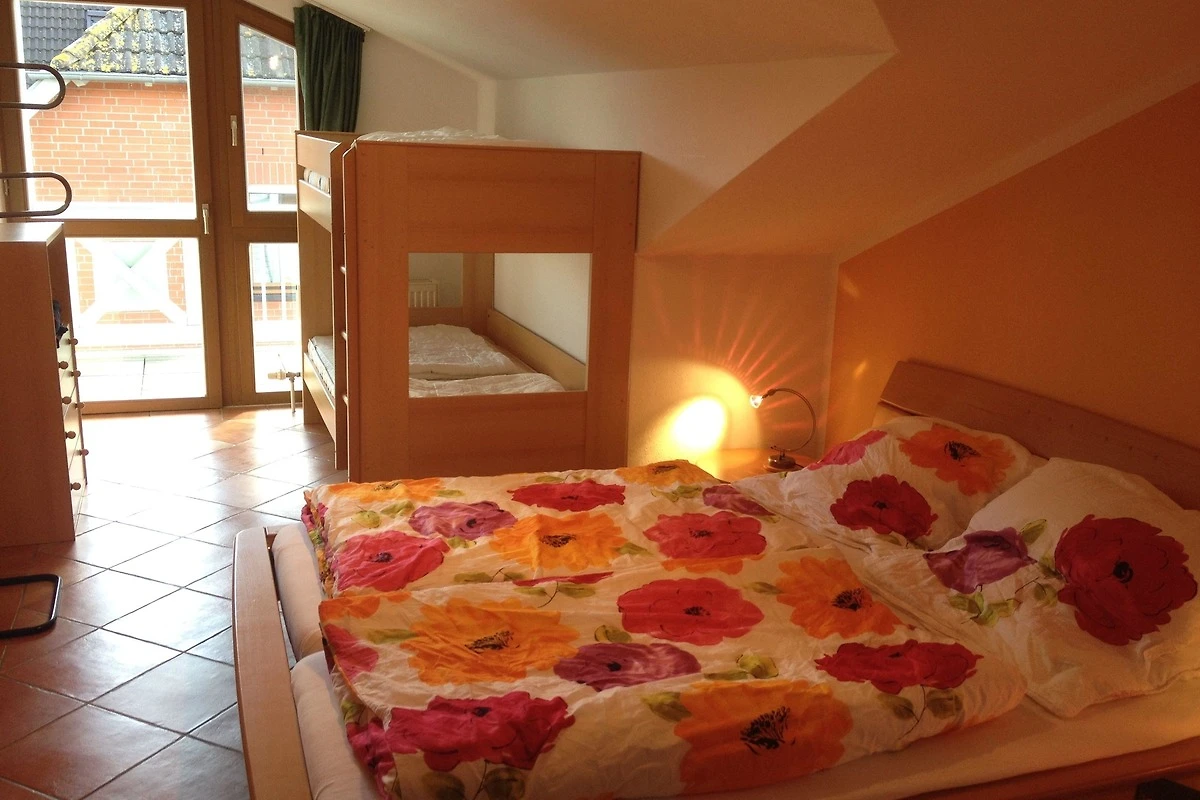 Die sehr helle Wohnung Zeesenhaus 5 im Ferienpark Seedorf verfügt über 66 qm und hat ein Schlafzimmer mit Doppel- und Etagenbett sowie im Wohnbereich noch eine Schlafnische mit Doppelbett für zwei Personen.