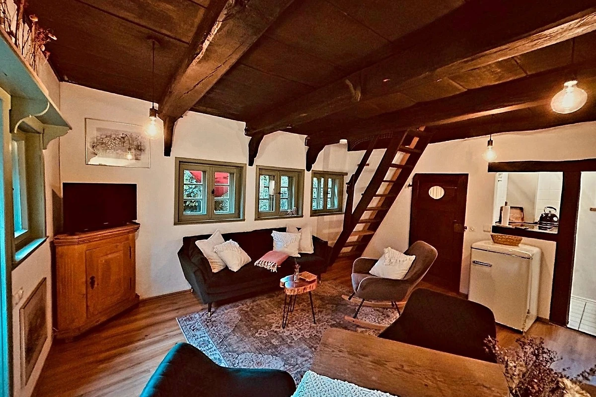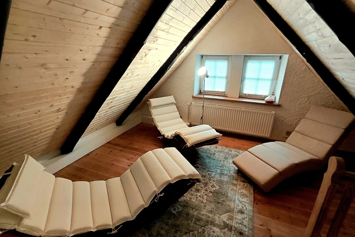 Über eine kleine Holztreppe gelangen Sie ins Obergeschoss (nicht durch eine Tür getrennt). Unter dem gemütlichen Dachgebälk erwartet Sie ein grosszügiger Schlafbereich mit einem Doppelbett und einem Einzelbett.