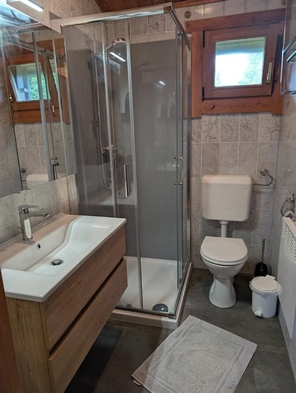 Badezimmer mit Dusche, WC, Waschtisch und Spielgelschrank.