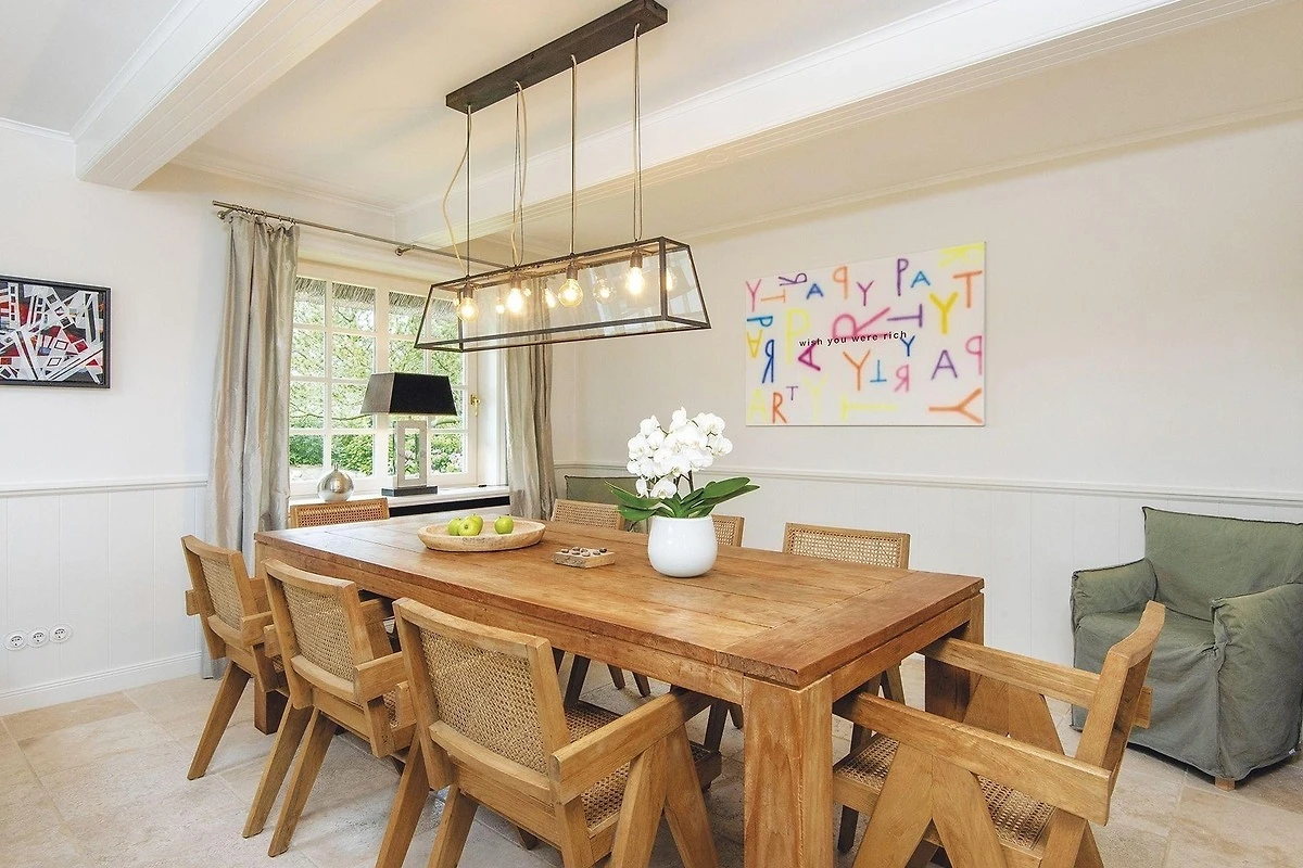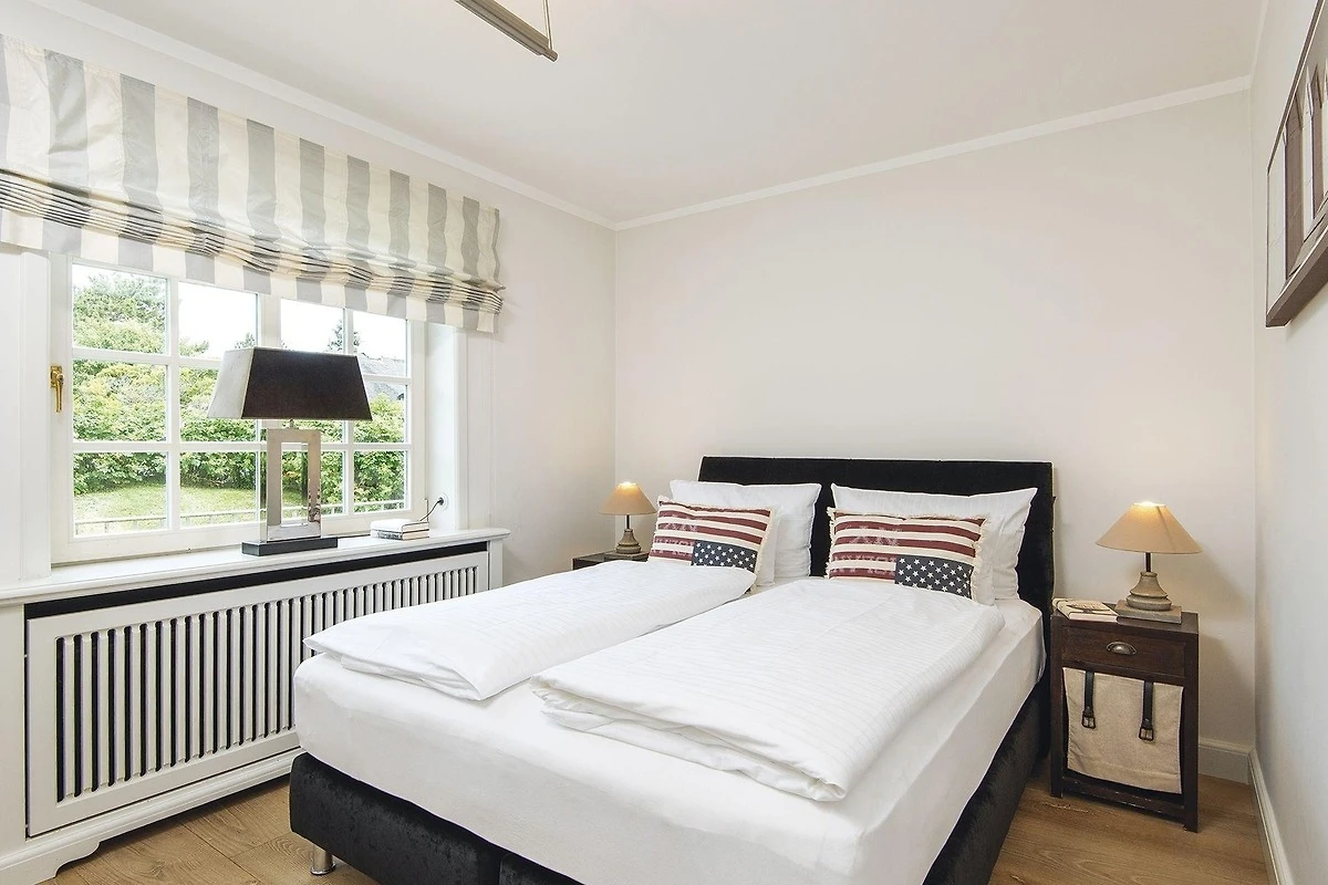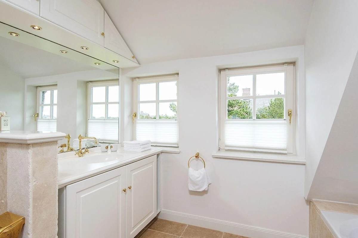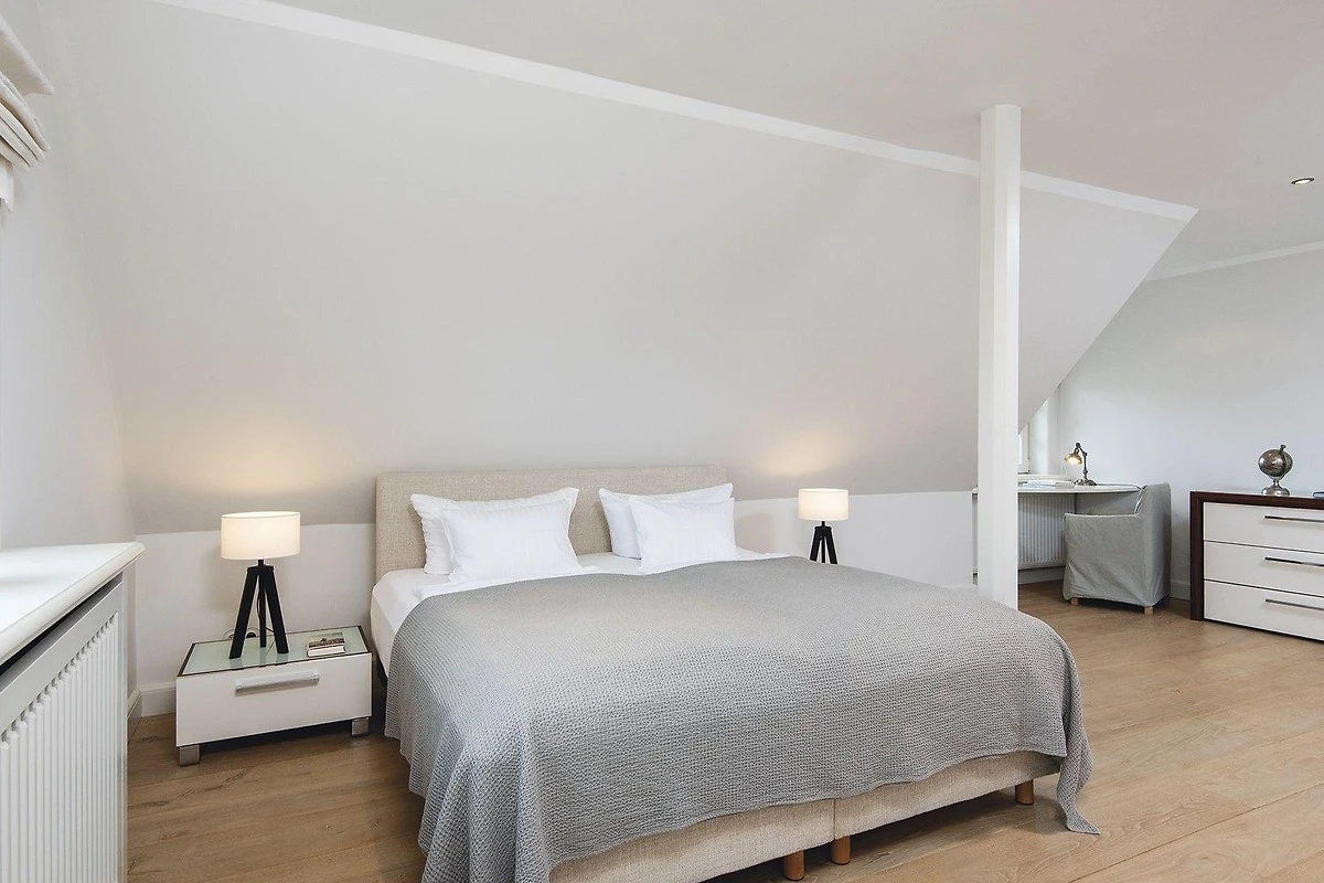Schlichte Eleganz trifft Wohnlichkeit - hier erwartet Sie von allem nur das Beste. Durch das luftige Entrée erreichen Sie den lichtdurchfluteten und überaus grosszügigen Wohn- und Essbereich. Bodentiefe Fensterfronten mit gleich zwei Terrassentüren ermöglichen den grandiosen Blick in den umzäunten Garten Richtung Süden über die Felder bis zum Kampener Leuchtturm "Langer Christian". Gleich zwei Tafeln für sechs bzw acht Personen, eine davon in der offenen voll ausgestatteten Küche, laden zu geselligen Runden ein. Ausserdem sorgen ein Kachelofen und elegante Sofas nebst grossem TV für den Gemütlichkeitsfaktor. Über einen kleinen Flur gelangen Sie zu den zwei schönen Doppelschlafzimmern im Erdgeschoss - eine Seltenheit in Kampen! Eines mit Schreibtisch und Terrassenaustritt nach Westen, beide mit geräumigen Einbauschränken, natürlich nebst ebenerdigem Duschbad. Im Obergeschoss fällt die Wahl schwer zwischen den zwei grosszügigen Doppelschlafzimmern jeweils mit begehbarem Kleiderschrank und DuschWannenbad en suite, eines mit atemberaubenden Blick vorbei am Leuchtturm bis nach Wenningstedt, das andere erfreut das Auge mit den beschaulichen Reetdächern Kampens. Im Untergeschoss wird Wellness gross geschrieben. Eine Whirlwanne über Eck, eine gemauerte Dusche und die Sauna für bis zu Vier, sowie zwei Relaxliegen samt TV lassen keine Wünsche offen. Zudem befinden sich auf dieser Etage noch je ein Doppel- und ein Einzelschlafzimmer, sowie ein Duschbad. Ein grosszügiges Quartier für Familien und alle mit Sinn für Schönes.