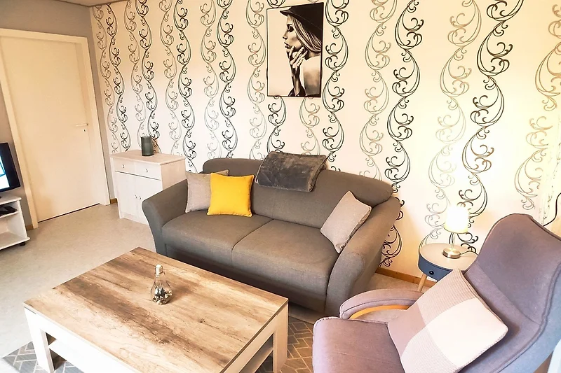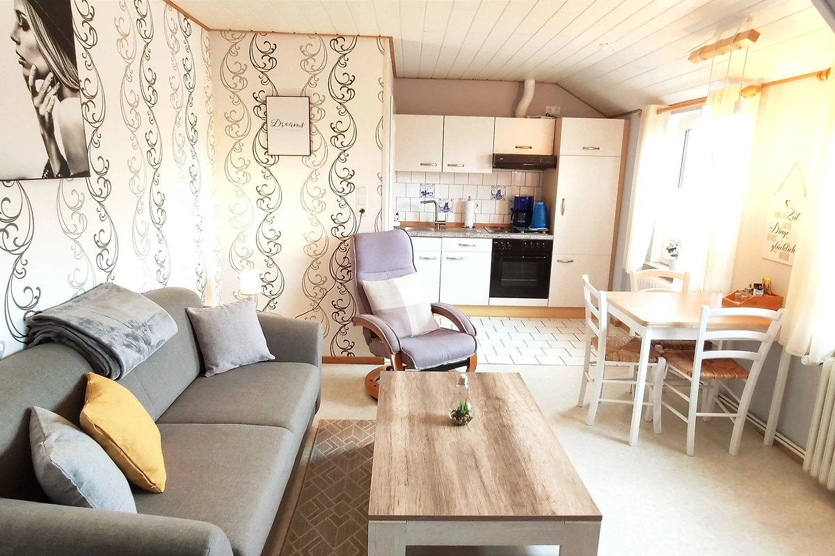 Es erwarten Sie ein gemütlicher Wohnbereich mit offener Küche, Schlafzimmer mit Doppelbett und Einzelbett sowie ein Bad mit Dusche/WC.
