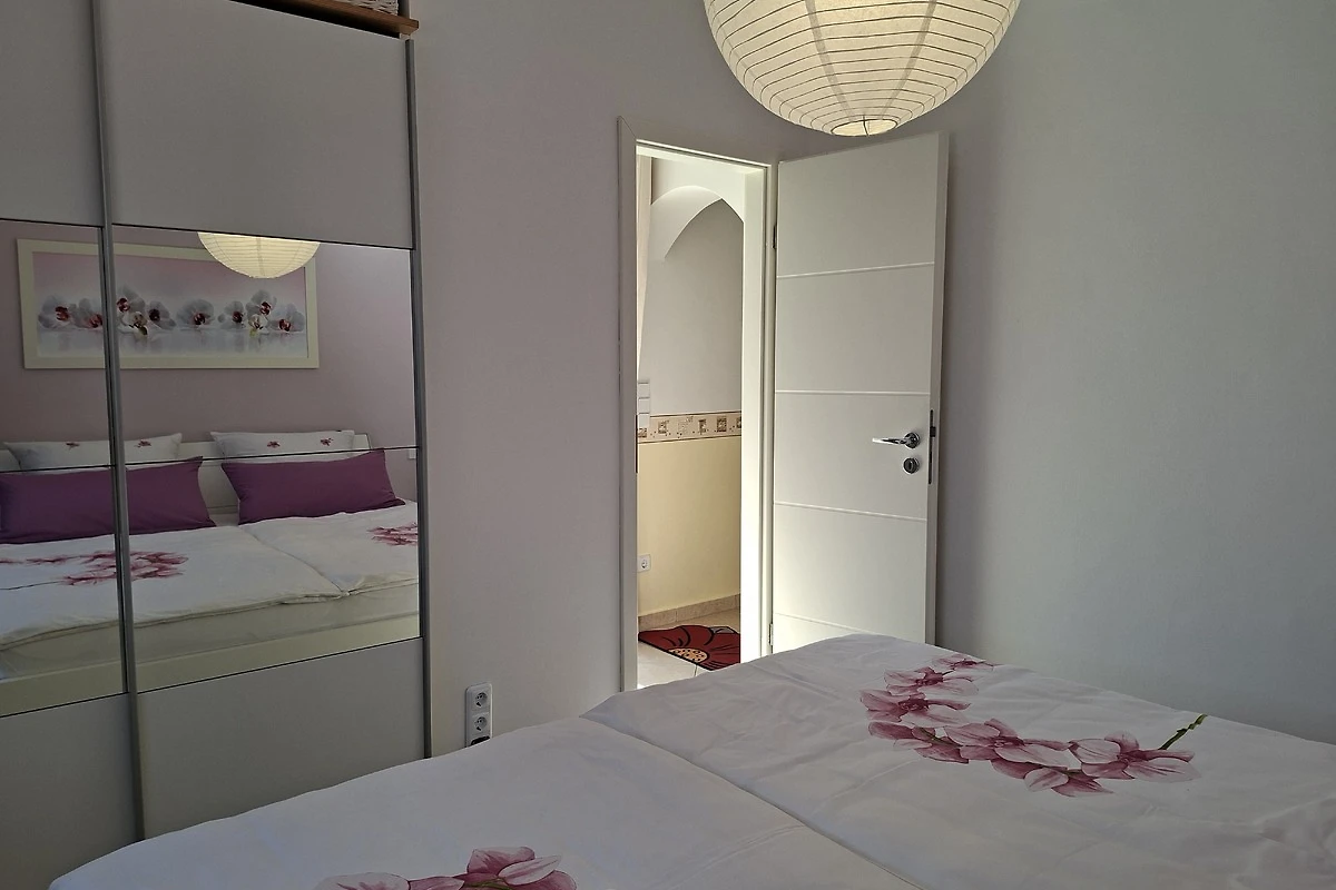 Das Doppelbett im Schlafzimmer hat verstellbare Lattenroste und bequeme Matratzen. Ihre Kleidung und persönliche Sachen können im großen Kleiderschrank mit verspiegelten Schiebetüren aufbewahrt werden. Für einen einspannten Schlaf sorgt die Klimaanlage im Raum, mit der gekühlt oder auch geheizt werden kann. Zur Aufbewahrung der Wertgegenstände ist ein Safe im Haus eingebaut.