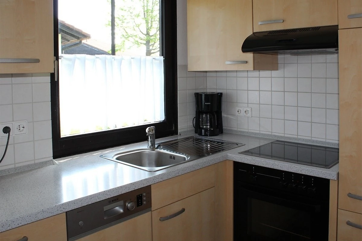 Küche: Spülmaschine, Elektroherd, Backofen, Kühlschrank mit Gefrierfach, Mikrowelle, Kaffeemaschine, Wasserkocher, Toaster