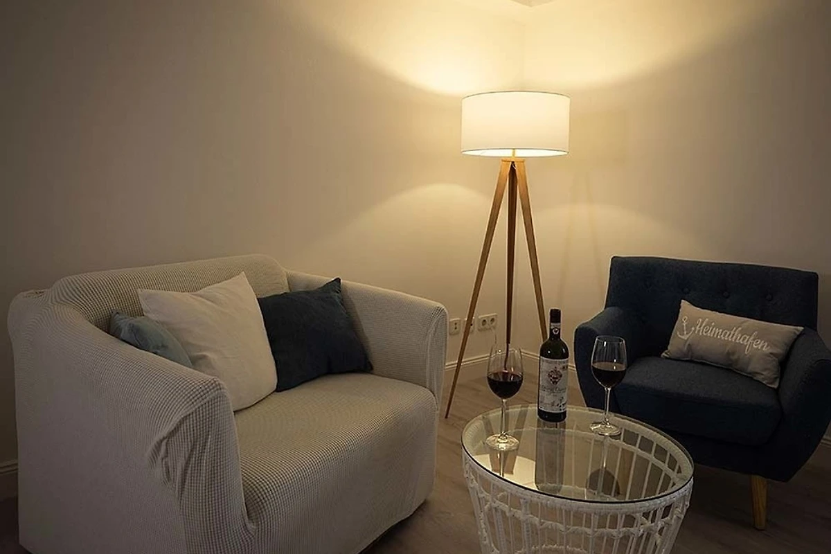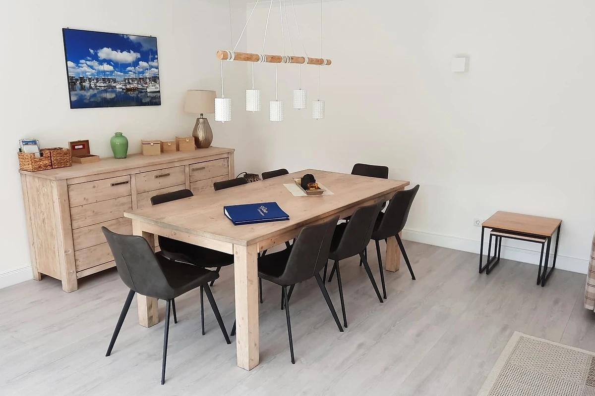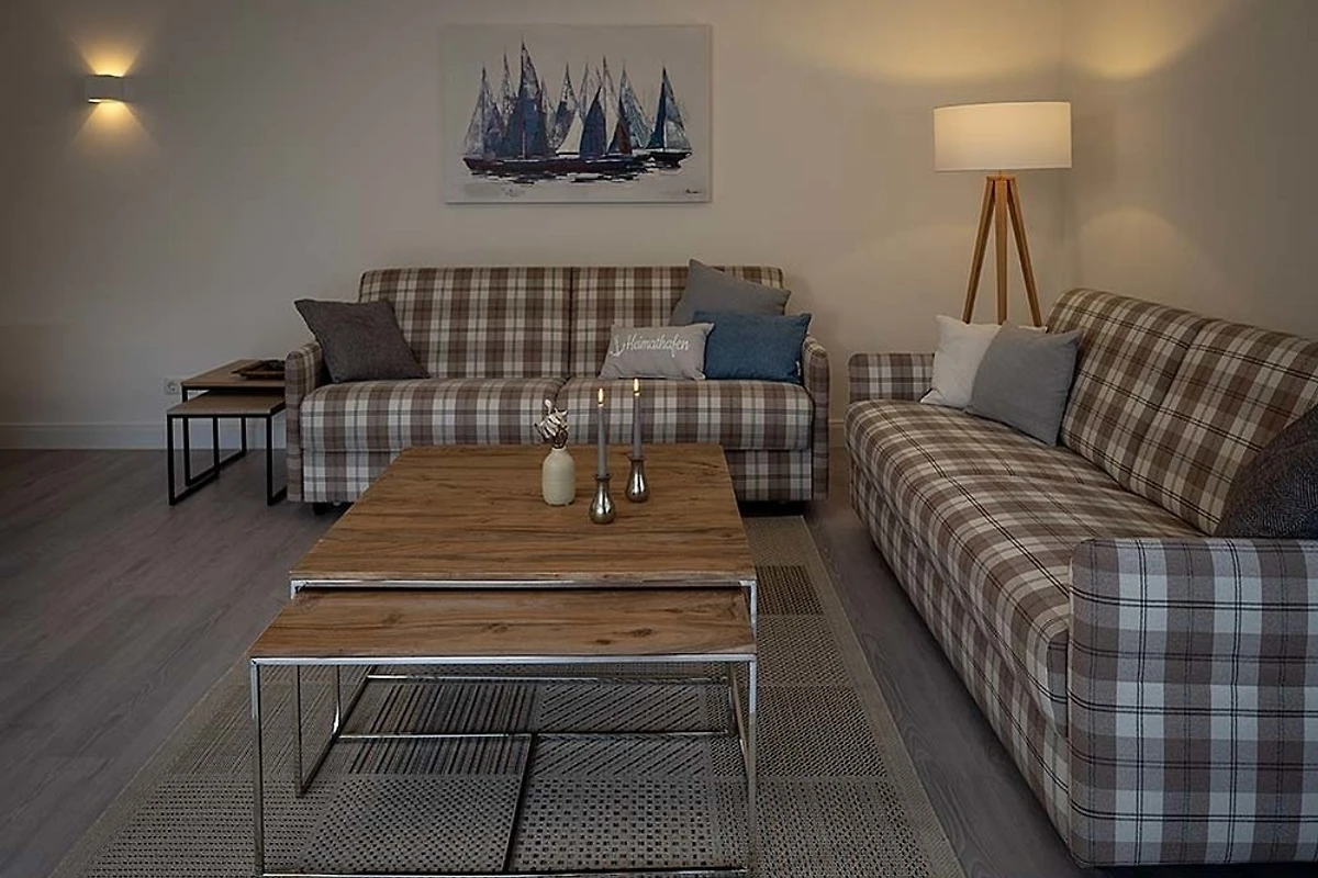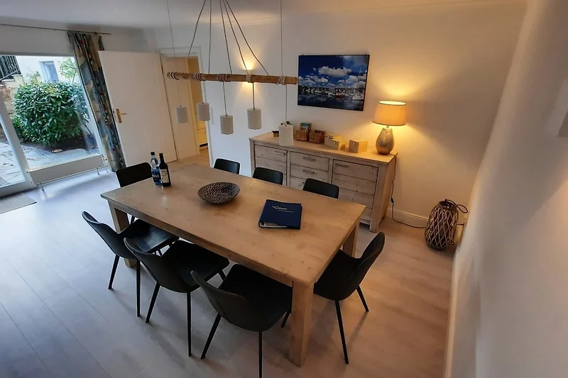 Im Wohnzimmer erwartet Sie ein modernes und helles Raumkonzept, das Gemütlichkeit und Funktionalität vereint. Hier befindet sich eine hochwertige Schlafcouch, die zusätzlichen Platz für Gäste oder für eine angenehme Nachtruhe bietet. Der grosszügige Essbereich lädt zu gemeinsamen Mahlzeiten ein, während das gemütliche Sofa zu entspannten Stunden nach einem erlebnisreichen Tag einlädt. Ein Fernseher sorgt für Unterhaltung, und dank der Internet-Flatrate sind Sie immer mit der Welt verbunden. Geniessen Sie den Blick auf die Flensburger Förde und lassen Sie sich von der einzigartigen Atmosphäre der Umgebung verzaubern.