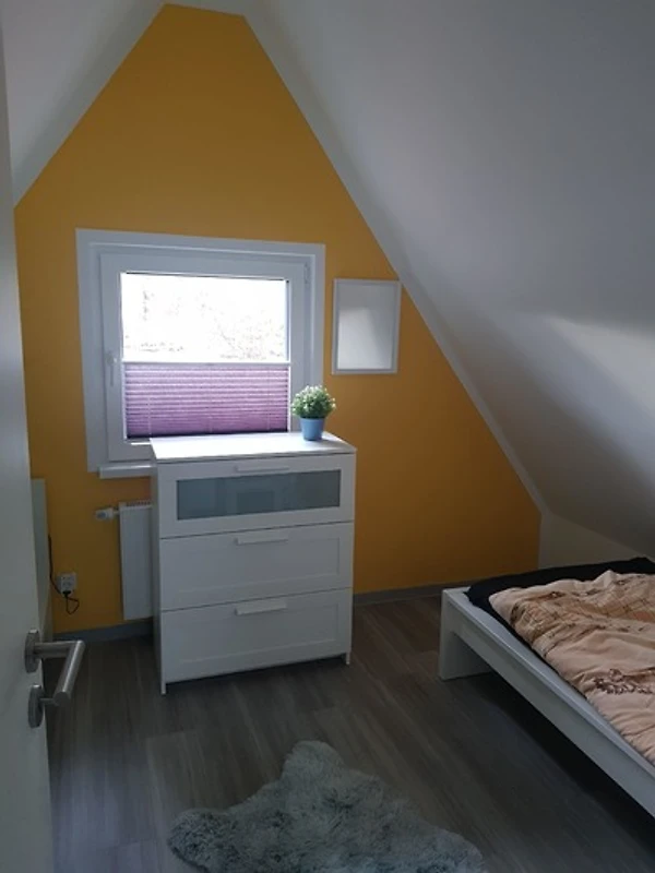 Im Erdgeschoss des Ferienhauses befindet sich ein Schlafzimmer mit Doppelbett, eine Wohnküche, ein Bad mit Dusche sowie der Wohn- und Essbereich mit Zugang zur Terrasse. Im Obergeschoss stehen zwei weitere Schlafzimmer mit je zwei Einzelbetten zur Verfügung.
