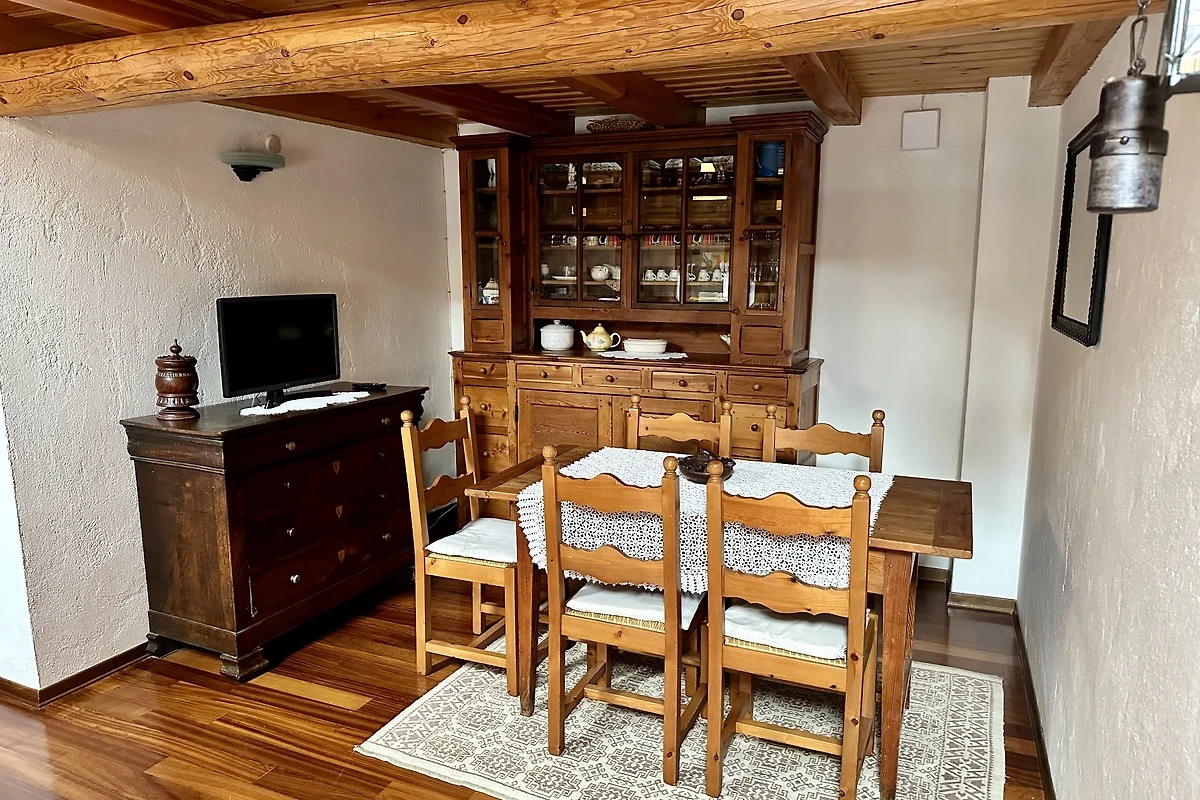 Die Wohnung ist mit äußerstem Geschmack im alpinen Stil eingerichtet und in den kleinsten Details gepflegt, mit antiken Möbeln und Gemälden sowie Teppichen. Die Zimmer, mit Holzböden und -wänden, können 4 Personen beherbergen (2 Personen im Doppelzimmer, 2 Personen im Zimmer mit Etagenbett). Die geräumige und helle Wohnung im Dachgeschoss ist ebenerdig und besteht aus einem offenen Wohnbereich mit drei integrierten Funktionsbereichen: Küchenecke, Essbereich und Wohnzimmer, einem großen und hellen Schlafzimmer mit Doppelbett, einem gemütlichen zweiten Zimmer mit Etagenbett, einer Diele und einem funktionalen Badezimmer mit kombinierter Badewanne und Dusche. Eine Terrasse vor dem Eingang bietet wunderbare Panoramaaussichten auf die Berge und lädt zum Sonnenbaden ein. Im Dorf gibt es keine Geschäfte (der nächste Lebensmittelladen ist 8 km entfernt), es gibt jedoch eine Bar/ein Restaurant, das schmackhafte gastronomische Spezialitäten anbietet.