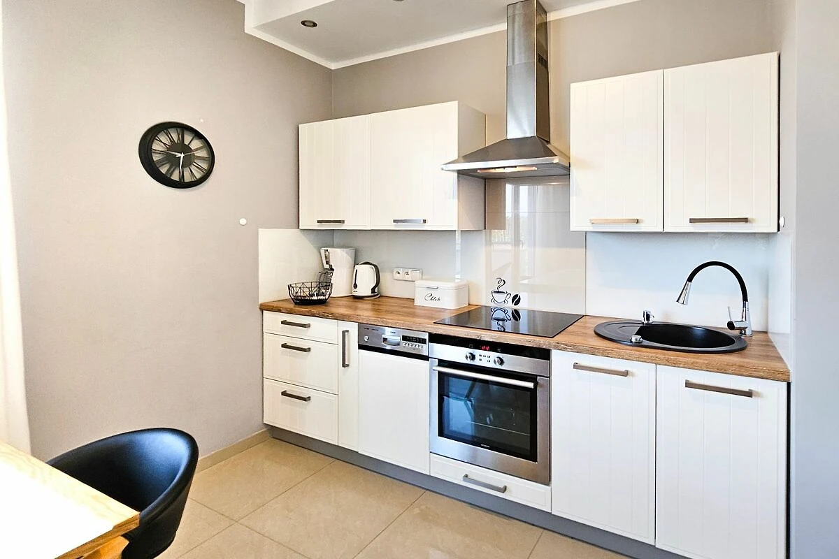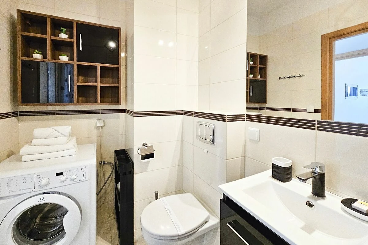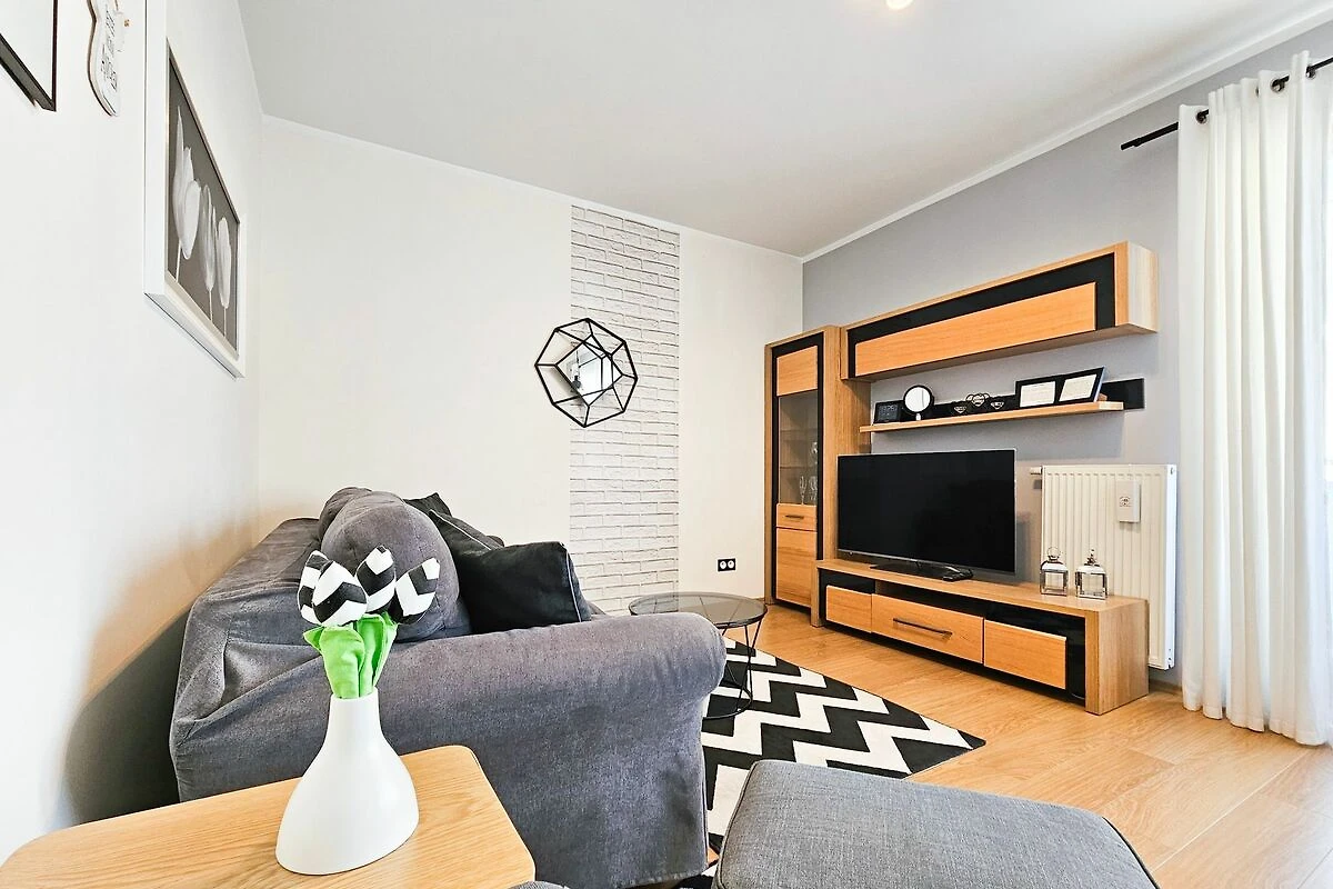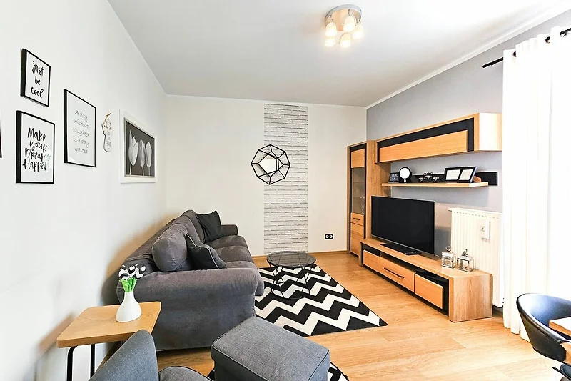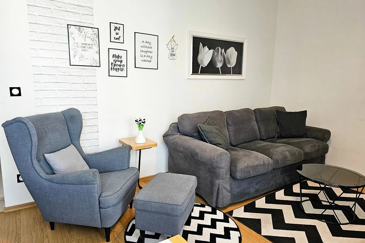 Die geräumige (44m2) 2-Zimmer-Ferienwohnung mit Balkon ist im 3. Stock eines Gebäudes mit Aufzug. Das Wohnzimmer besteht aus einem Erholungsbereich und einer Küchenzeile. Im Wohnzimmer, mit Balkonausgang, steht ein grosses Ecksofa mit Schlaffunktion (Schlaffläche 140x200cm), eine Kommode mit einem TV - Kabelanschluss (deutschsprachige Sender sind zugänglich).