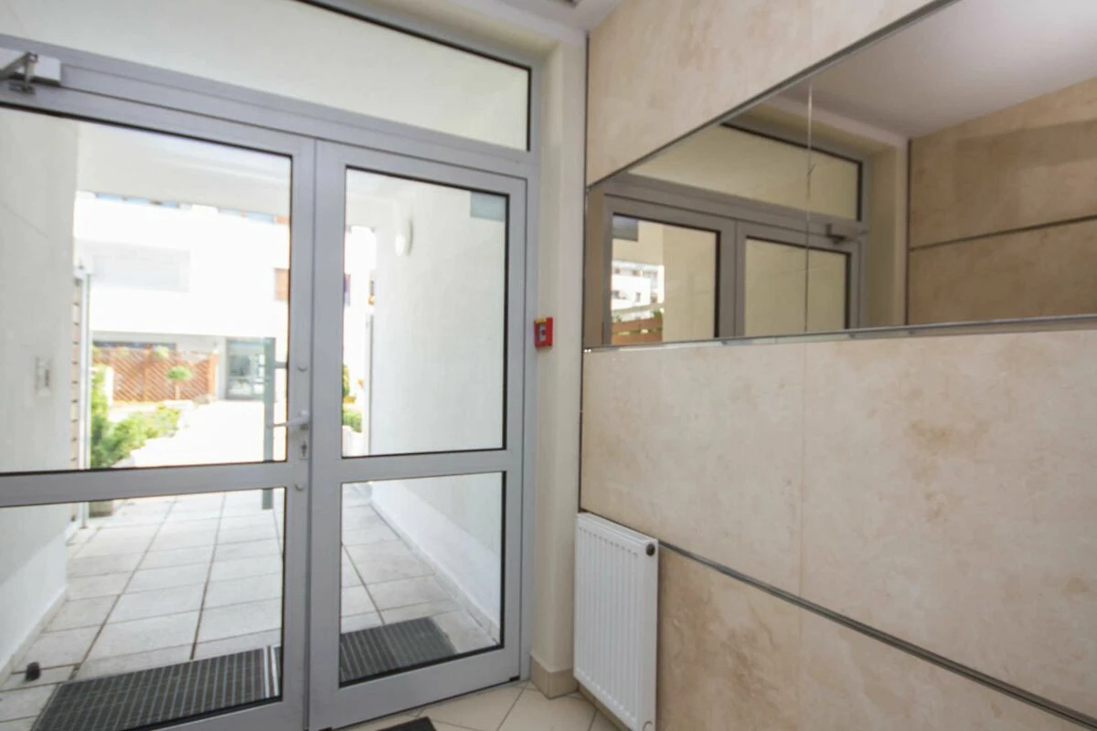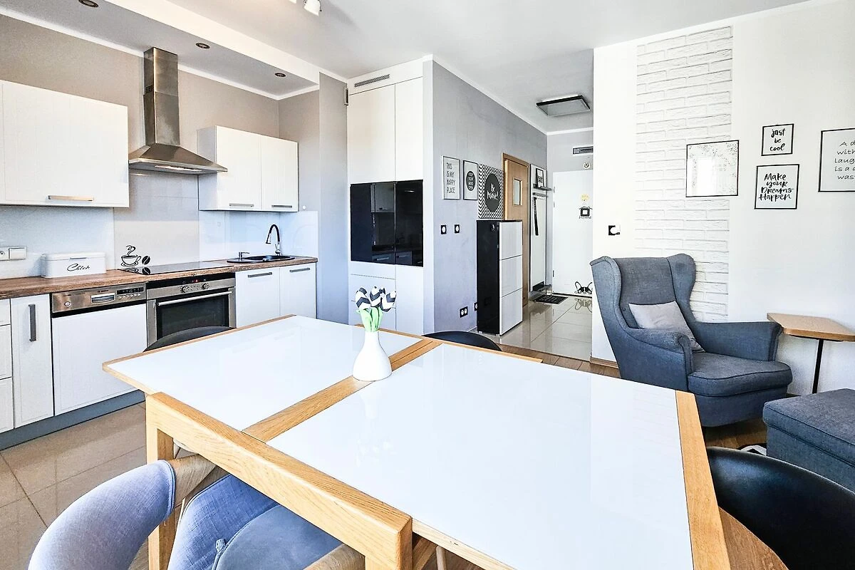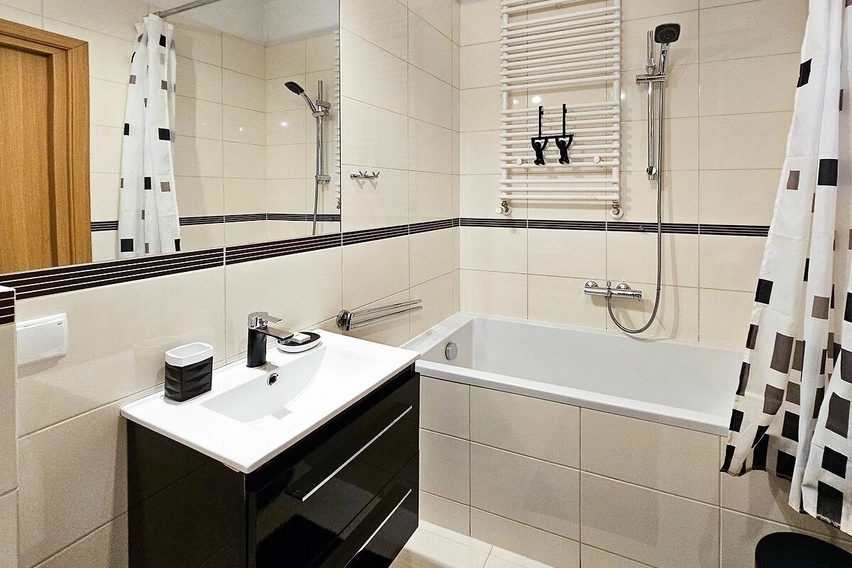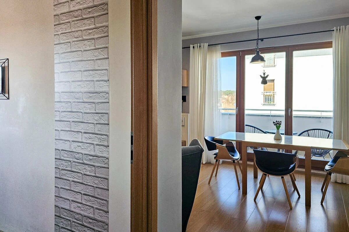 Die geräumige (44m2) 2-Zimmer-Ferienwohnung mit Balkon ist im 3. Stock eines Gebäudes mit Aufzug. Das Wohnzimmer besteht aus einem Erholungsbereich und einer Küchenzeile. Im Wohnzimmer, mit Balkonausgang, steht ein grosses Ecksofa mit Schlaffunktion (Schlaffläche 140x200cm), eine Kommode mit einem TV - Kabelanschluss (deutschsprachige Sender sind zugänglich).