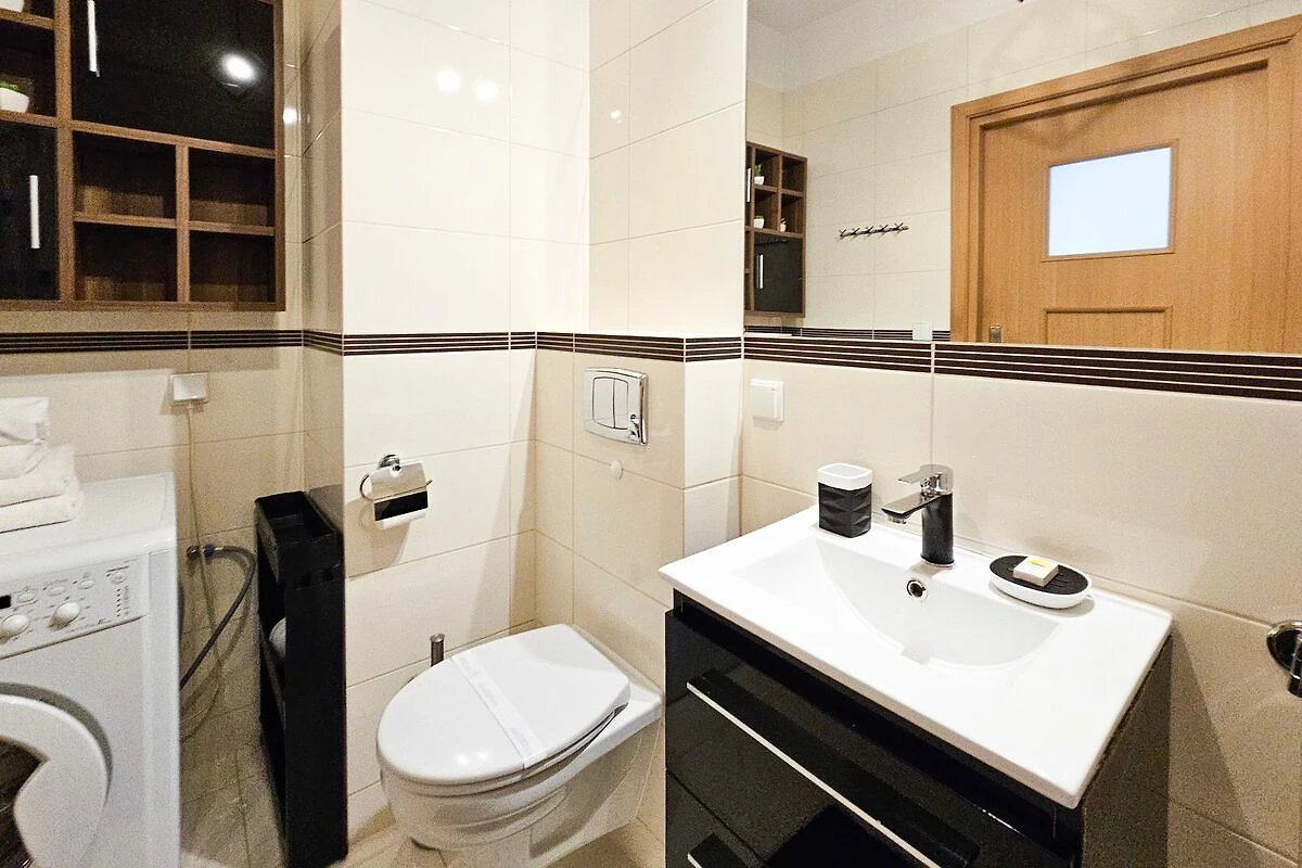 Das Badezimmer mit Badewanne und WC ist zusätzlich mit einer automatischen Waschmaschine ausgestattet.
